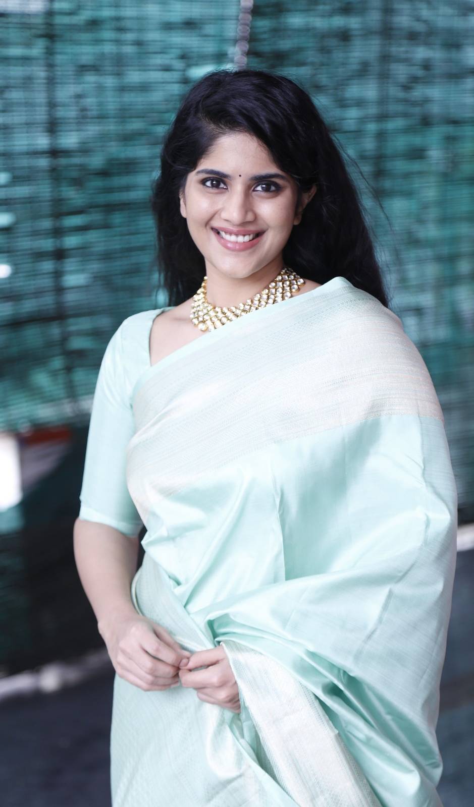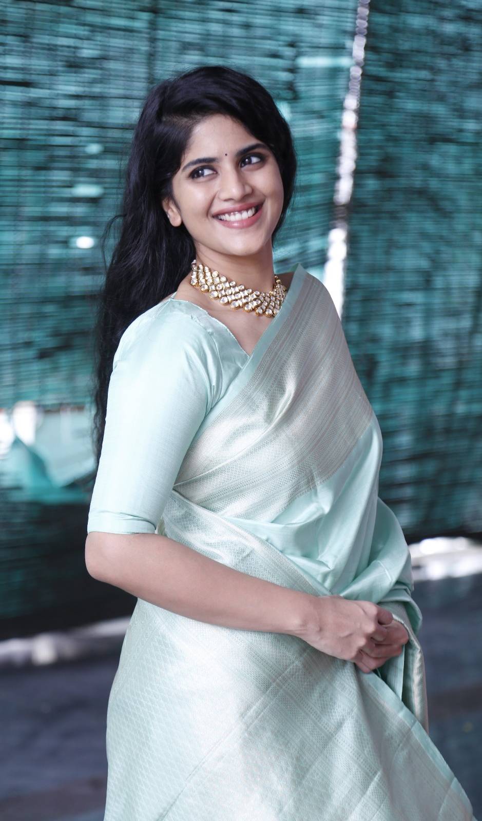 Megha Akash drapes on a mint green silk saree for “Kanaka Durga” launch!