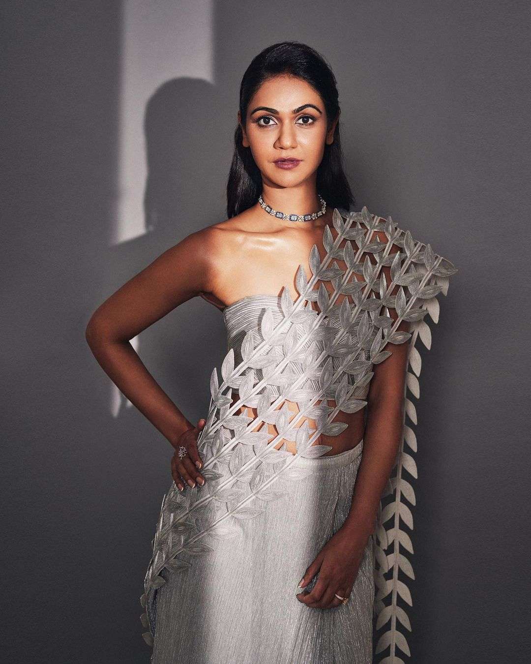 The silver-hued drape is cord worked and has a plain base towards the lower half. However, the upper half makes up for it with its leaf-detailed shoulder drape. She styled the saree with a sleeveless blouse.