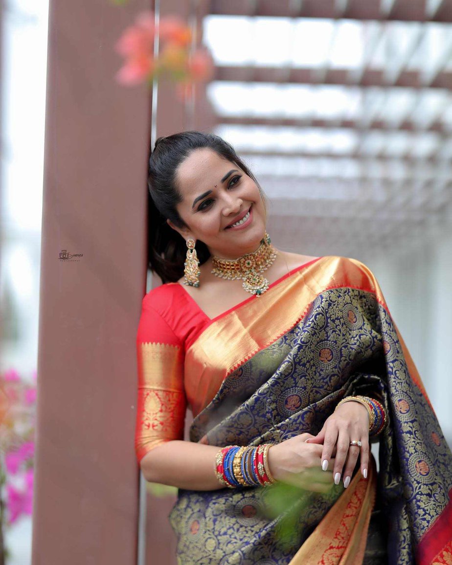 A round up of Anasuya Bharadwaj’s silk saree looks for inaugural functions! Celebrity Sarees