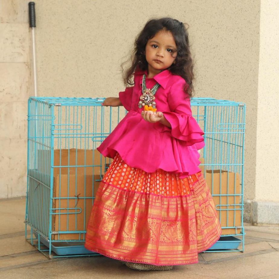 Ayra was dressed up in a pink peplum top with ruffle details and an orange pattu skirt with printed peacock motifs. Moreover, she also donned a statement neckpiece.