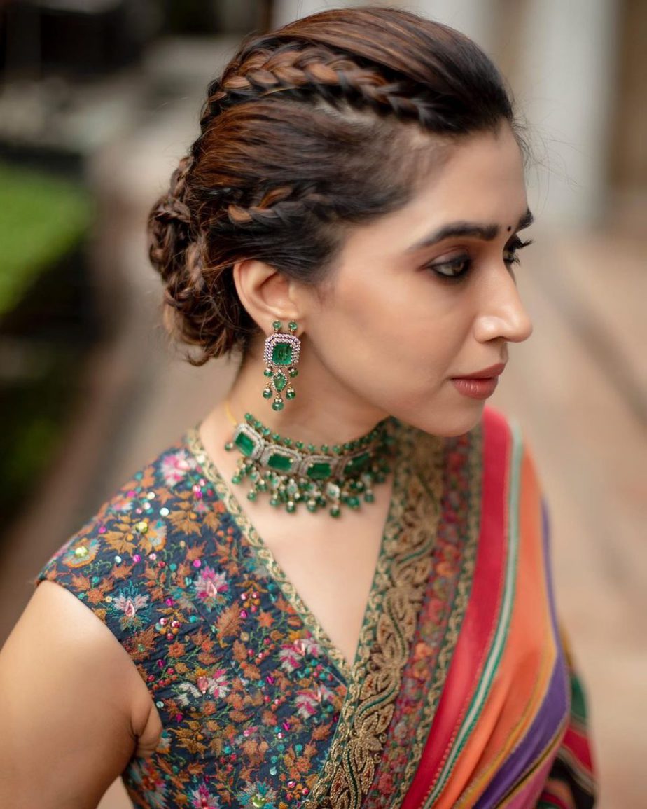 She accessorized the outfit with a pair of emerald studded diamond earrings and an identical choker by Amrapali. Her look was accomplished with a pleated low tied bun, blushed cheeks, lined eyes and nude lips.