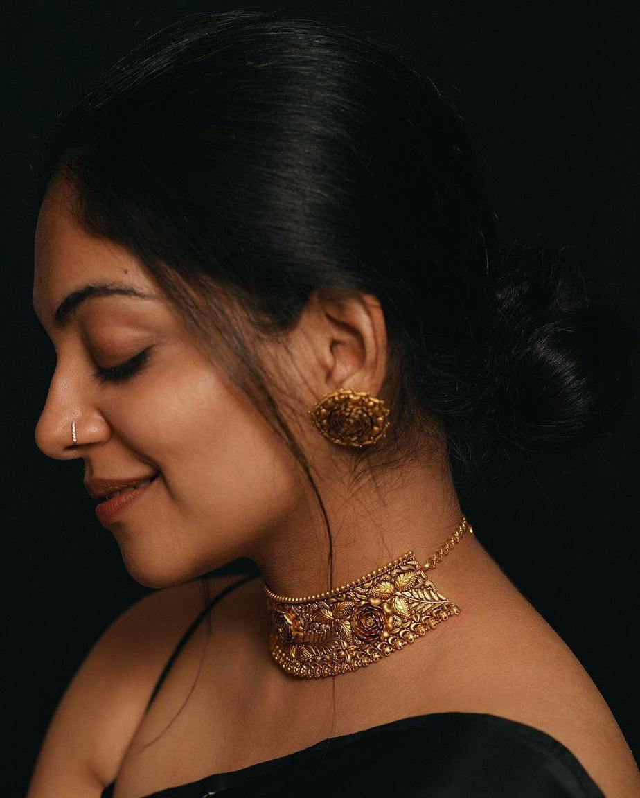 Ahaana opted for an vintage gold choker, a set of studs and bangles by OKJ Signet jewellery. Minimal make-up with low tied bun and brown lips accomplished the look.