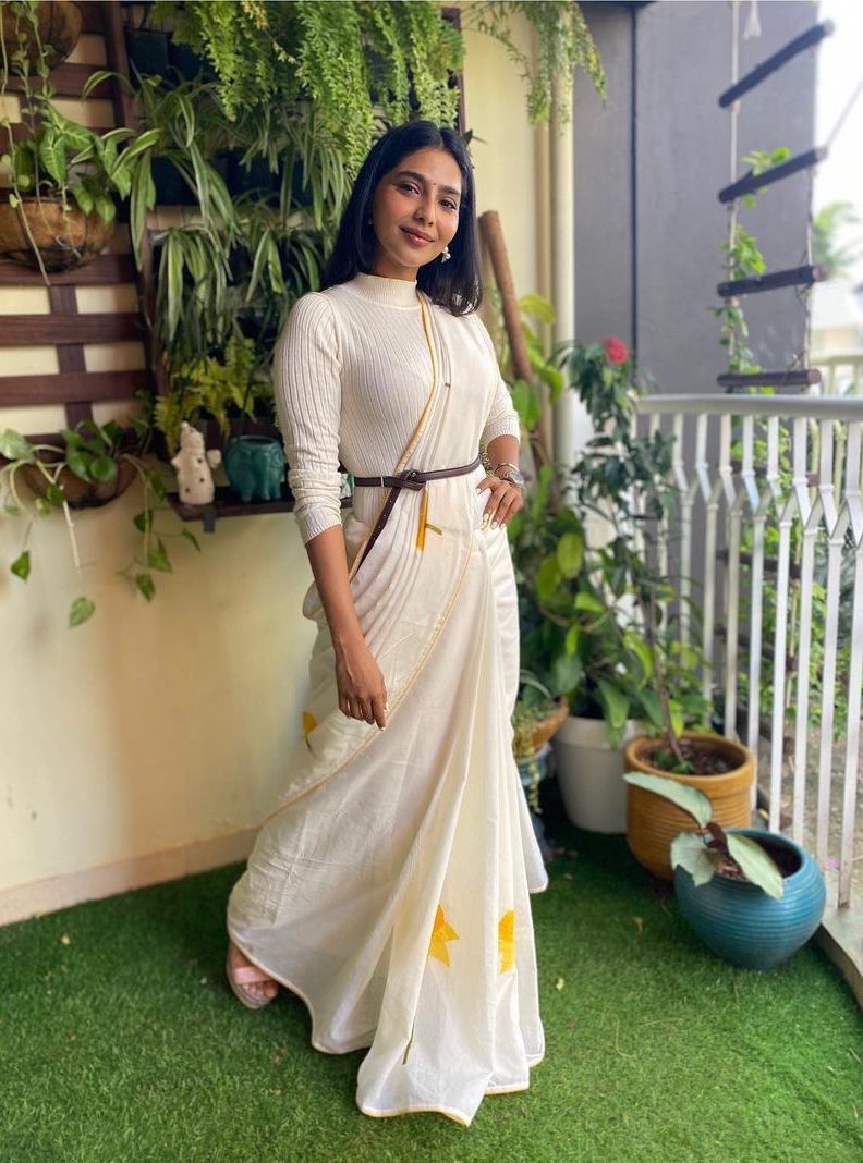 Whenever a trend comes up, everybody is eager to join the bandwagon and try the look as soon as possible. There are only a few of us who improvise it to get an extraordinary result. Actress Aishwarya Lekshmi took to her Instagram to post some pictures of her in an off white belted saree by Rouka. Though we adored the saree, what we loved was how she styled it.