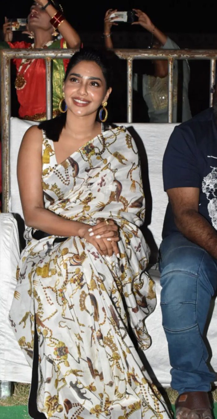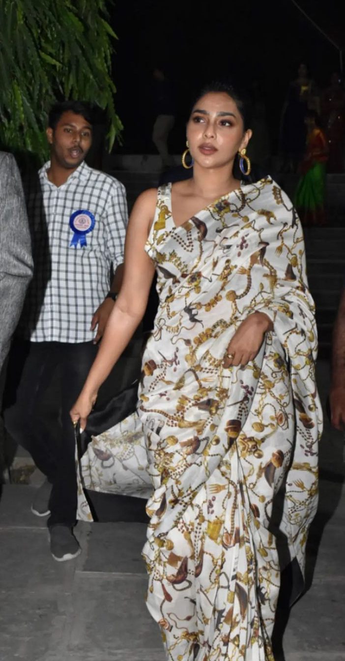 Actress Aishwarya Lekshmi’s debut Tollywood movie, “Godse” is all set for a grand release. The actress who plays the role of a cop in the movie promises it to be a thrilling ride for the viewers. To promote the movie, she recently attended a college fest in an ivory drape by House of Three Studio. This is from their Dravida collections.