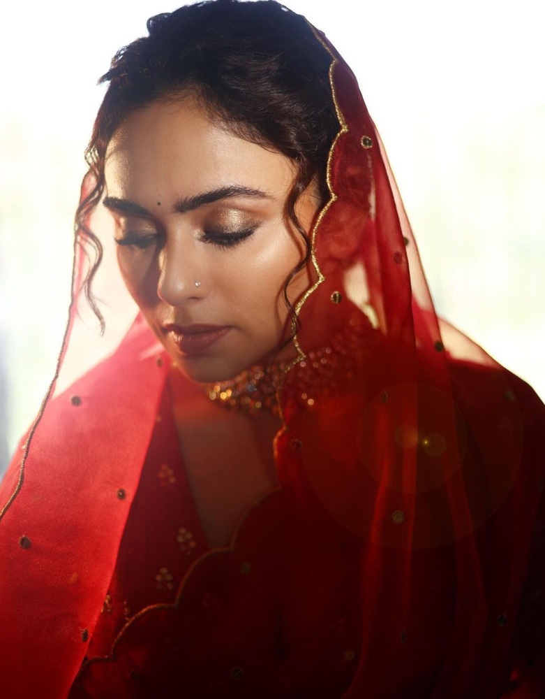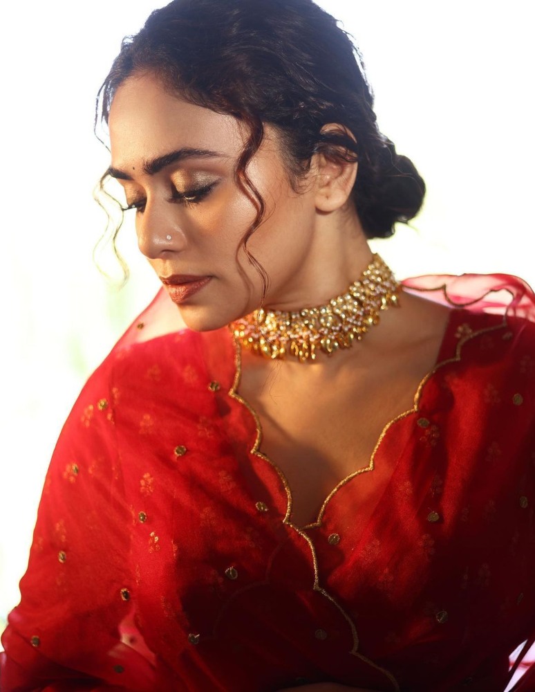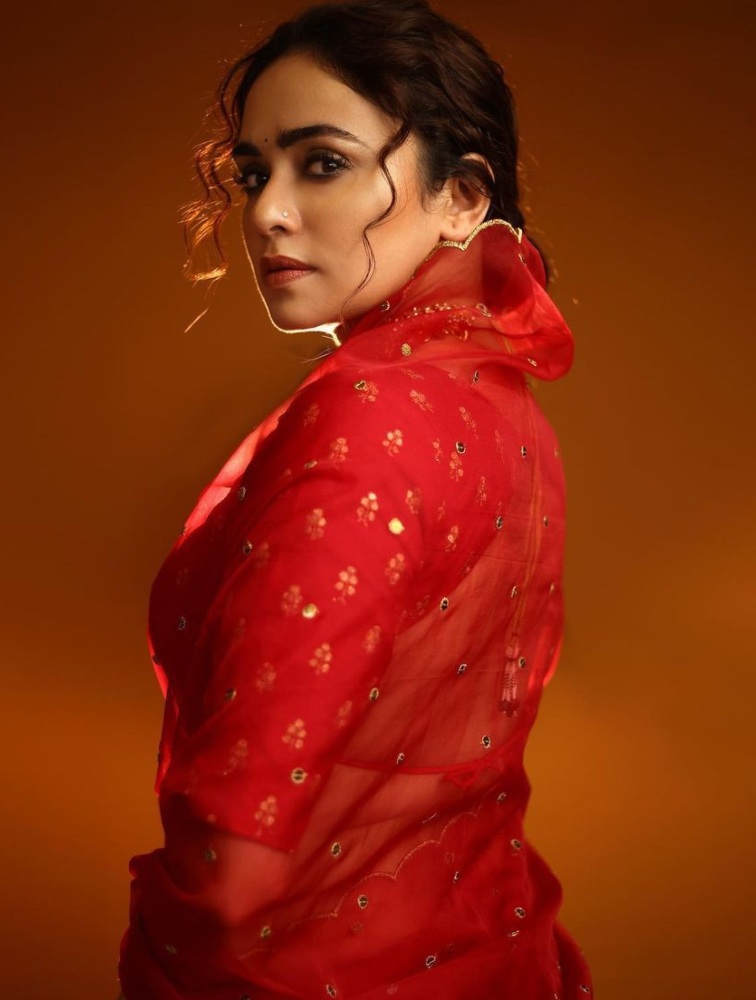 Amruta Khanvilkar wore a full-hand embroidered sequence organza saree from the label K2fashioncloset. The saree was paired up with a pure raw silk hand-embedded blouse piece. She looked fierce in this pure red saree.
