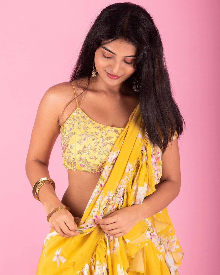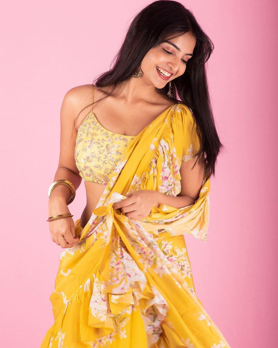 Actress Ananya Nagalla is emerging as one of those actresses who have their ethnic game right on point. The actress had also turned heads with her look on Ugadi and recently posted some pictures of her in a yellow ruffle saree by Surayya Mahboob. The saree is from their latest collections.