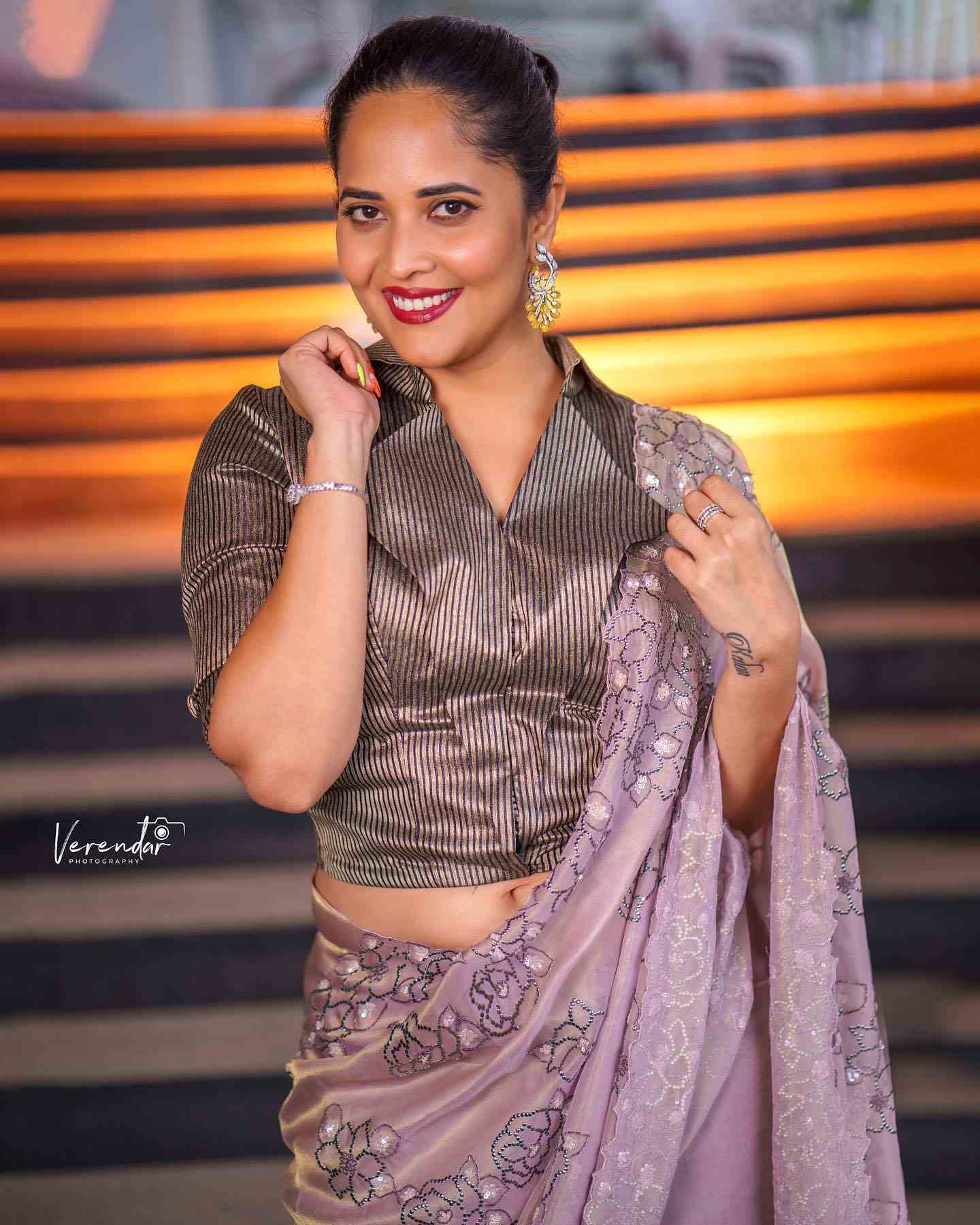 Check out the pictures below-anasuya bharadwaj in pink saree by brand mandir for jabardasth