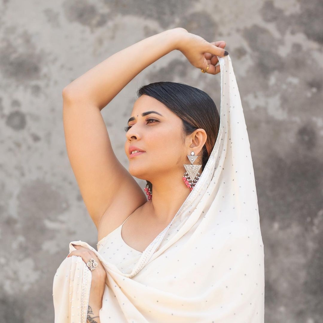 Who doesn’t lose their heart to an ivory saree? We all love one irrespective of our colour or fashion choices. Not only do they suit every occasion, but they also are quite in vogue at all times. If you love them light ones, try your hands at this number worn by actress Anasuya Bharadwaj for Jabardasth.