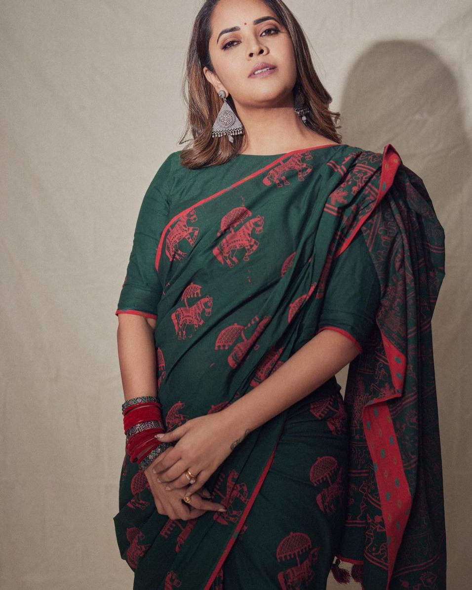 Nothing beats the charm of a simple drape. While we all might be crazy about silk ones, the simpler ones often come in handy. This green saree worn by actress Anasuya Bharadwaj to an inaugural function certainly looks good. It is designed by Sreemukhi Mekala for her eponymous brand.