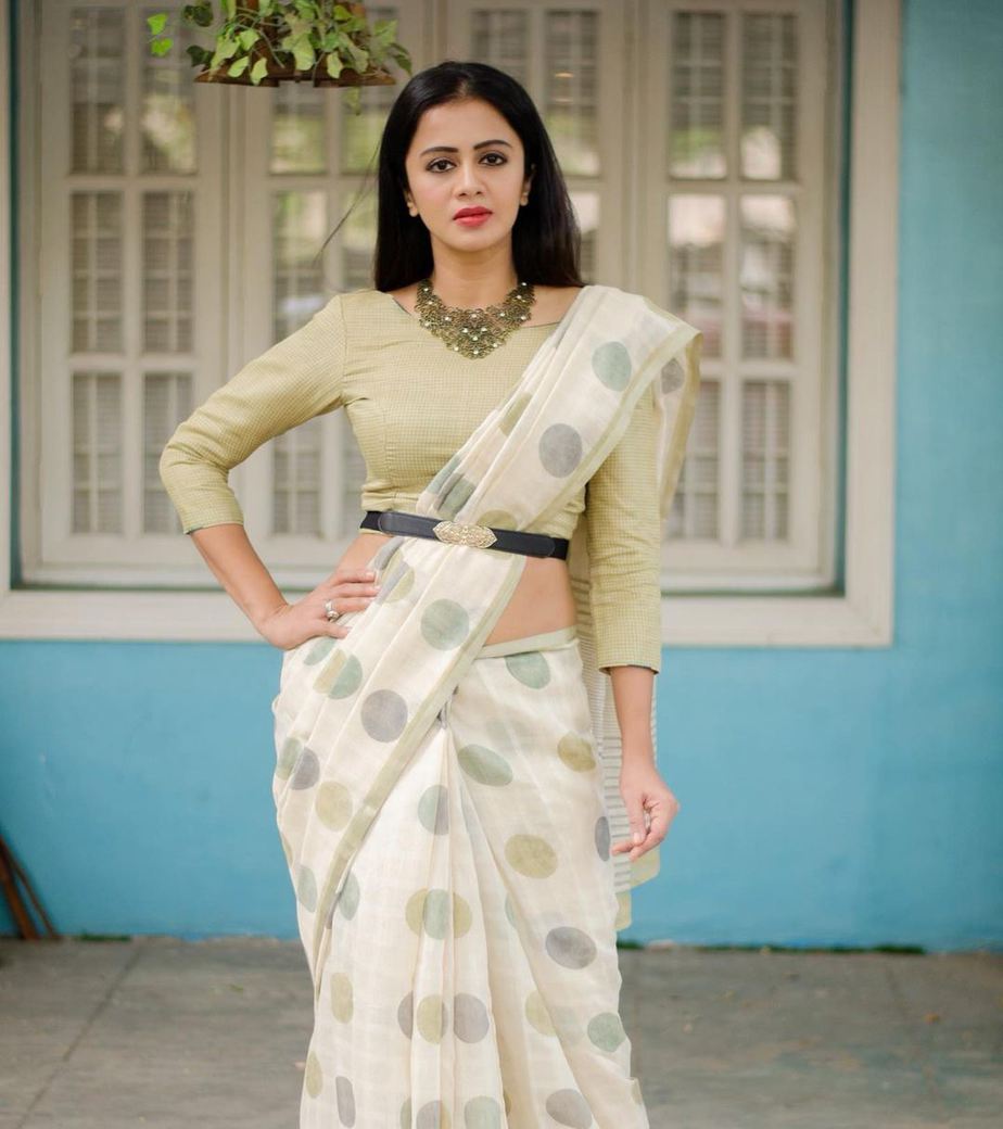We all love to buy new outfits and things get even more interesting if it’s a saree. However, it might not be possible for us to do so whenever an occasion comes up. Therefore, one of the options we have is to style a simple saree and make it look fashionable. If you are not sure how to go about it, here’s anchor Anjana Rangan giving you a wonderful choice with the way she stylized her off-white saree and lime green blouse by Jeeni.