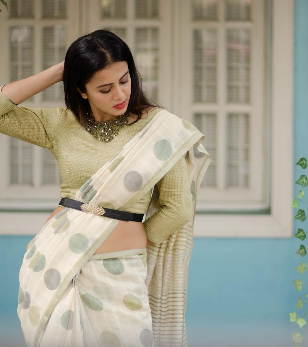The simple cotton saree is filled with dot prints in grey and lime green matching its hemline. However, the pallu of the saree showcases stripes in both colours. Anjana paired the saree with a full-sleeved lime green striped blouse. What we absolutely loved was the way she wore a black waist belt with a gold buckle to add some drama to the outfit.