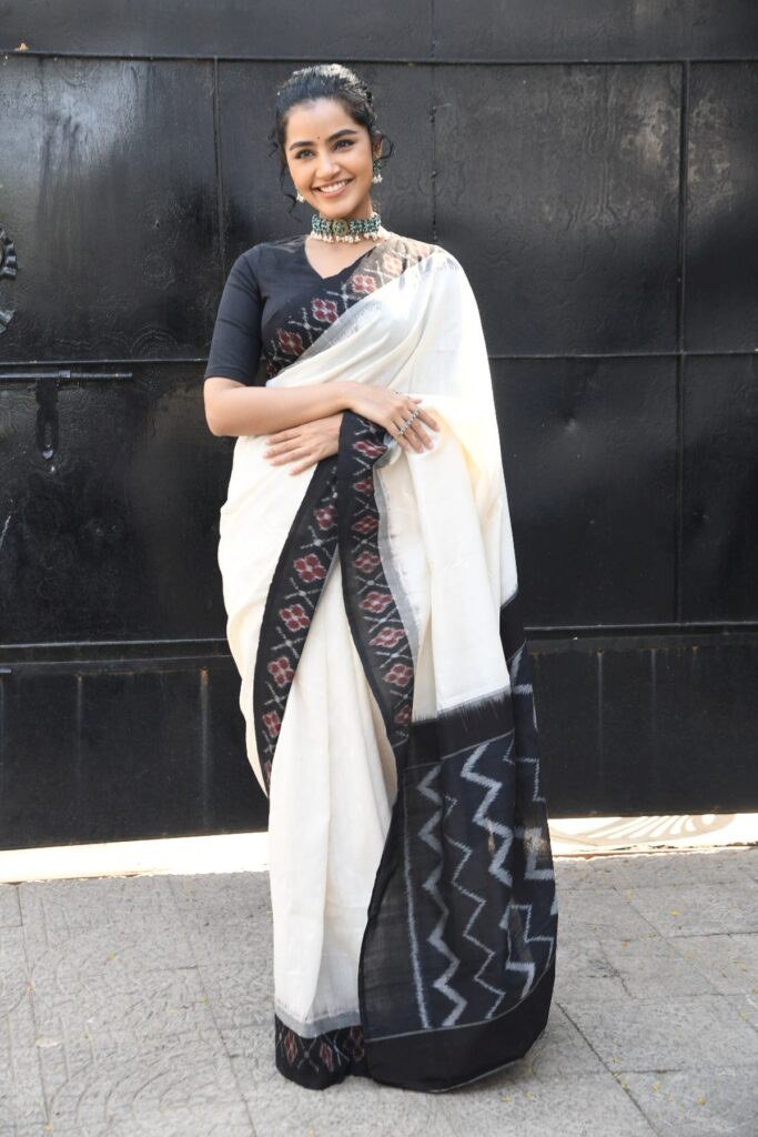 Anupama Parameswaran in a white ikat print saree for “18 Pages” promotions!