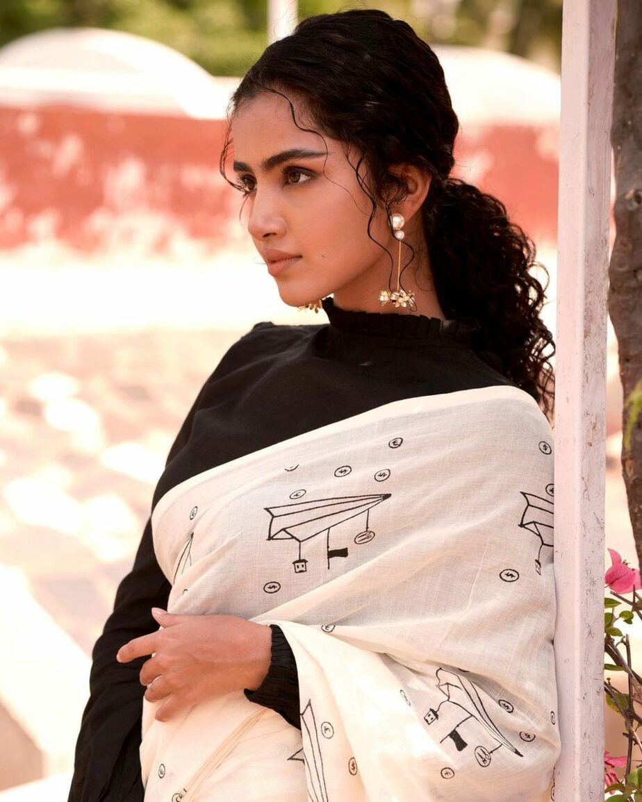 Actress Anupama Parameswaran is a traditional beauty and looks beautiful in all her attires. She mostly resorts to sarees in which she looks the best. Her latest slew of photos has her posing in an ivory handmade cotton saree from Jebsispar by Jebin Johny.