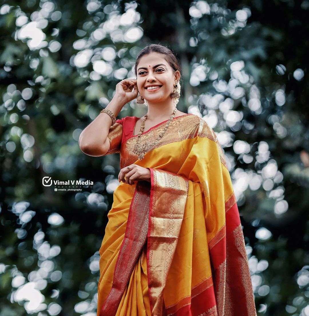 We know how actress Anusree Nair loves sarees dearly. She is seen putting forth some glorious silk saree looks that are easy to be recreated with minimal effort. For a wedding that she had to attend, she was seen in a yellow Kanchipuram saree and we can’t take our eyes off her.