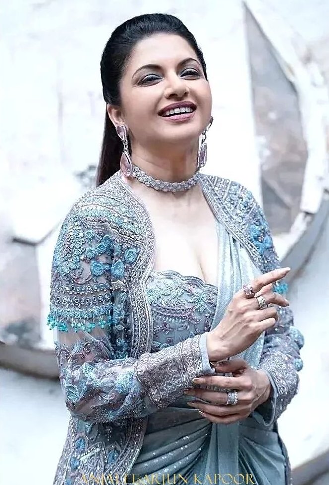 Sequinned sarees have a lot of variety when it comes to designs. There can be fully sequinned ones, hem sequinned ones and partially sequinned ones. No matter how much they display the sequins, they are all lovely to be worn and simply look at. This powder blue saree worn by Bhagyashree fits the bill. It is designed by Anjalee and Arjun Kapoor for their party collection.