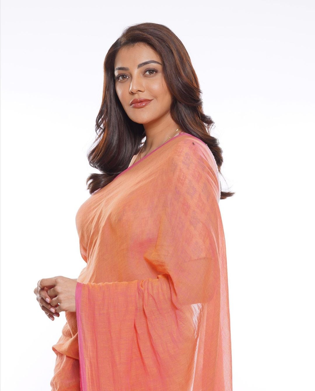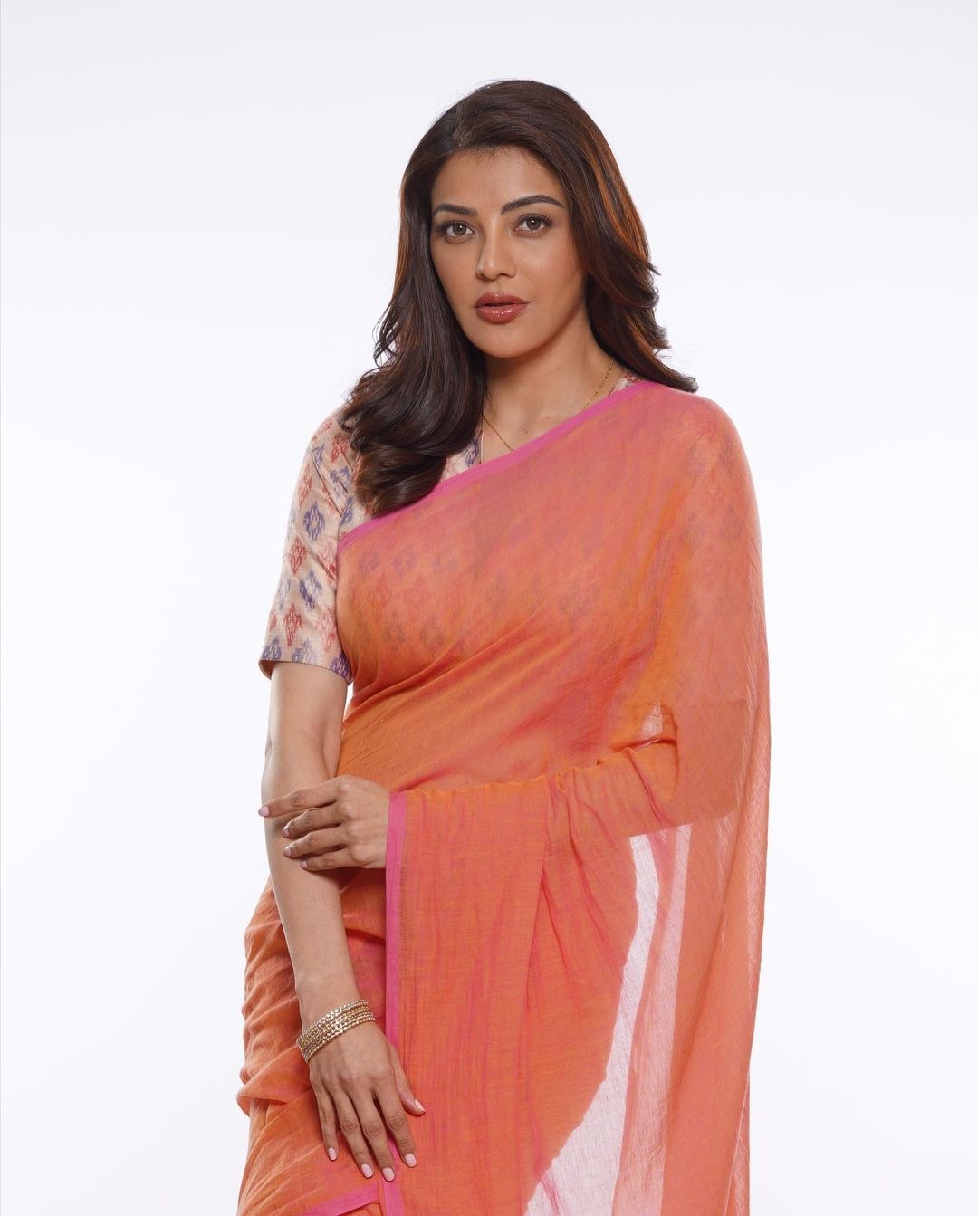 Actress Kajal Aggarwal is known to have raised the style bar pretty high with her sartorial choices on and offscreen. The actress is also a part of a number of ads which again have her looking spotlessly beautiful. Her latest look for an ad has her wearing a peach saree by Suta Bombay.