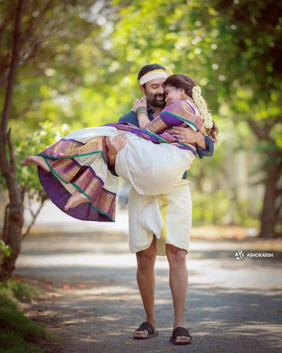 Sneha wore a white Kanchipuram saree with a violet korvai border adorned in gold zari. She matched it with a blouse in violet and pattu border. Sneha rounded out the look with a set of antique gold earrings and a long neckpiece by Rajatamaya. Prasanna coordinated with his wife in a dhoti and blue plain shirt.