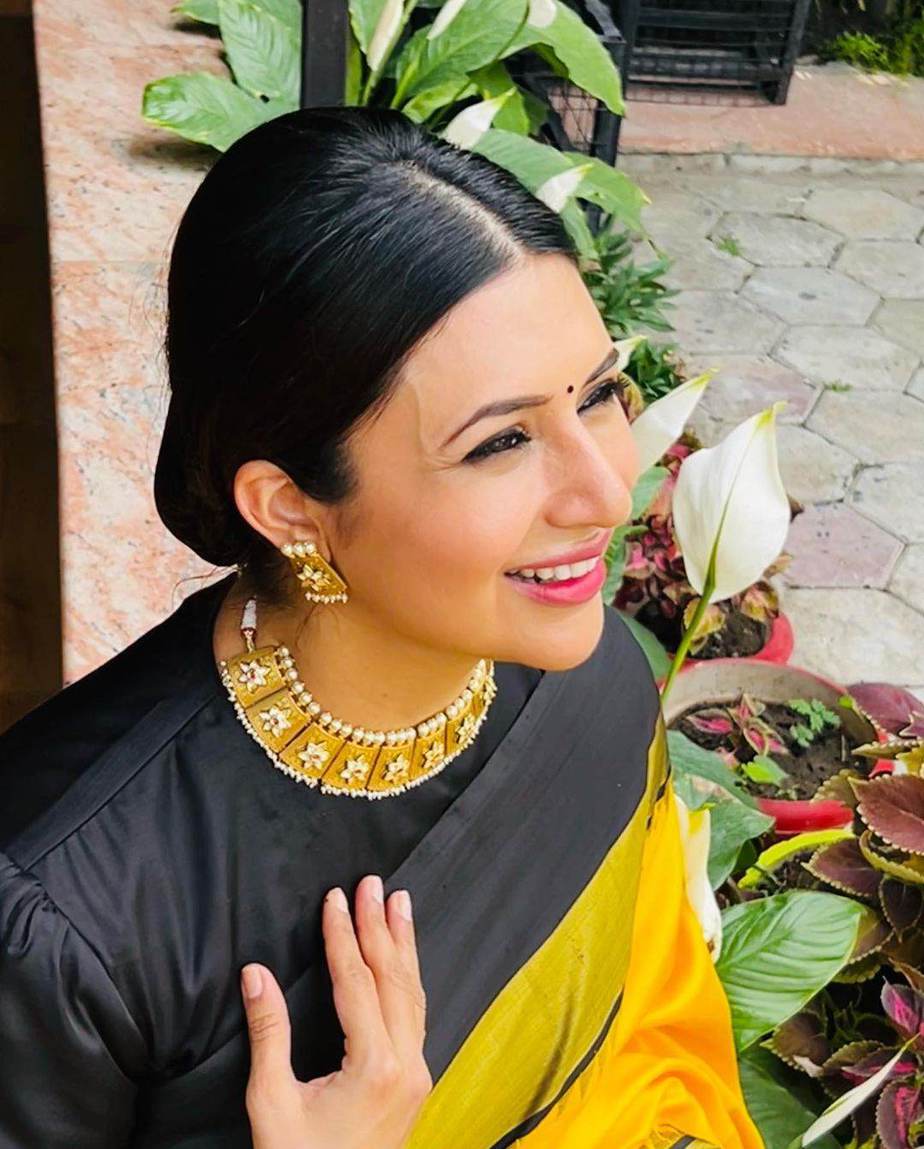 Keeping the saree in mind, Divyanka decided to go for a choker neckpiece in gold, a matching set of earrings and a bangle by Kushal’s Fashion Jewellery. She rounded out the look with a low tied bun, contoured cheeks, bindi, kohl-rimmed eyes and pink lips