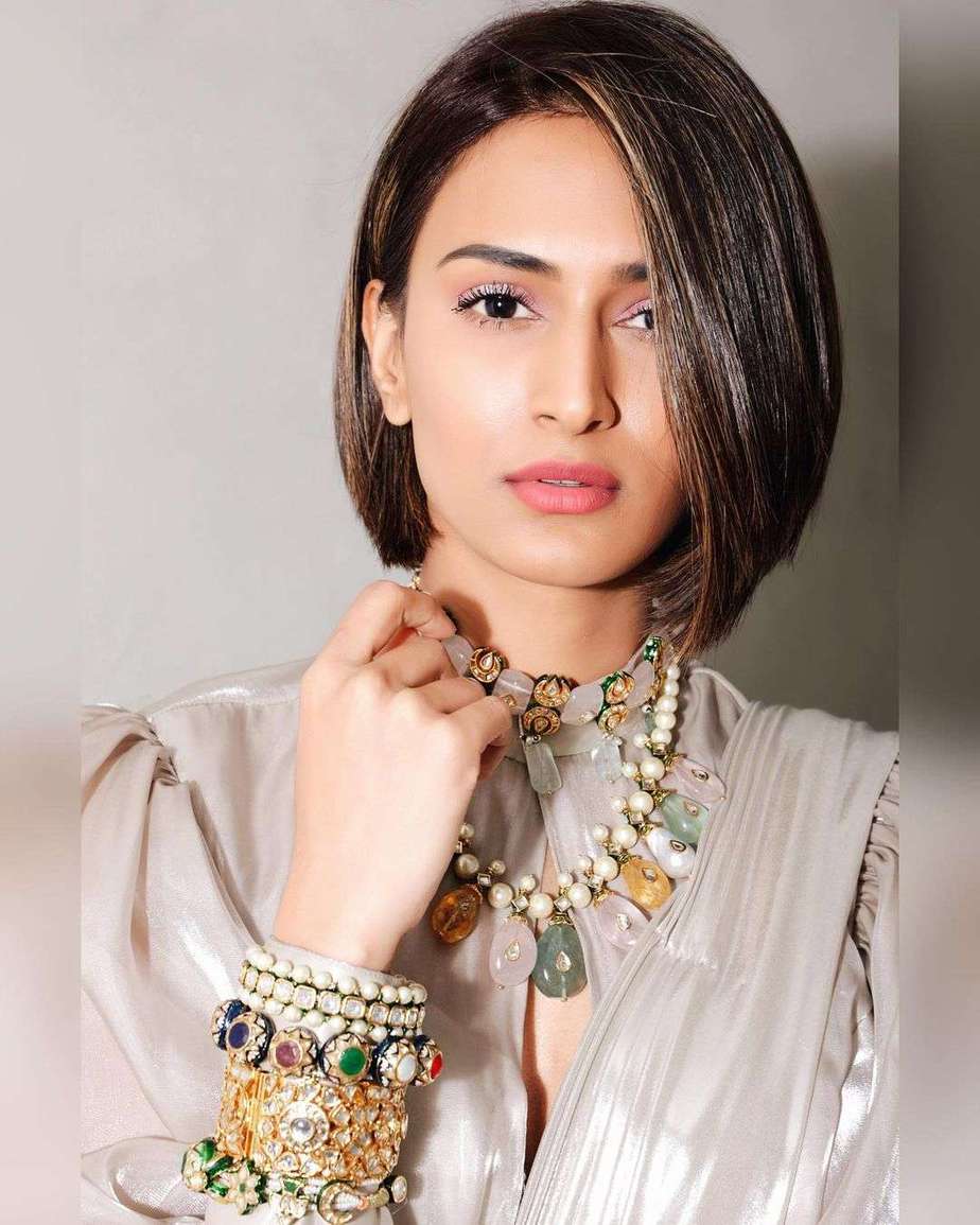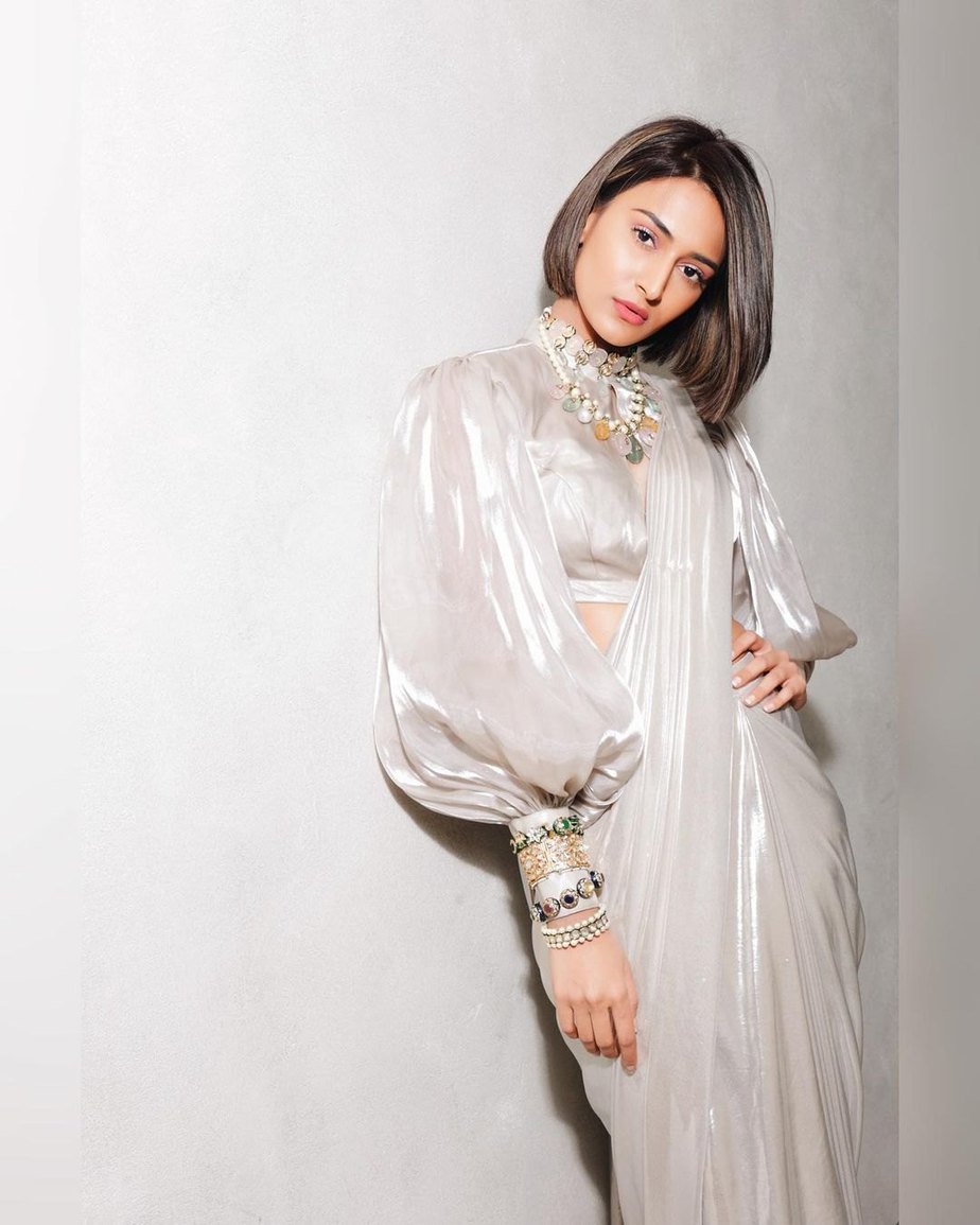 Actress Erica Fernandes is one of the most loved personalities on Television. Right from her acting to her fashion, everyone is a fan of her style. The actress who was spotted at an award function last day graced the event in a silver pre-draped saree by Deme by Gabriella and looked flawless. This one should grab your attention if you love metallic drapes!