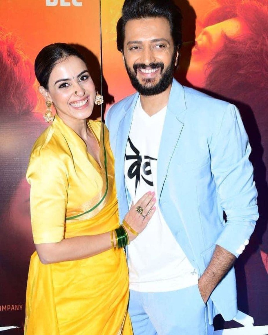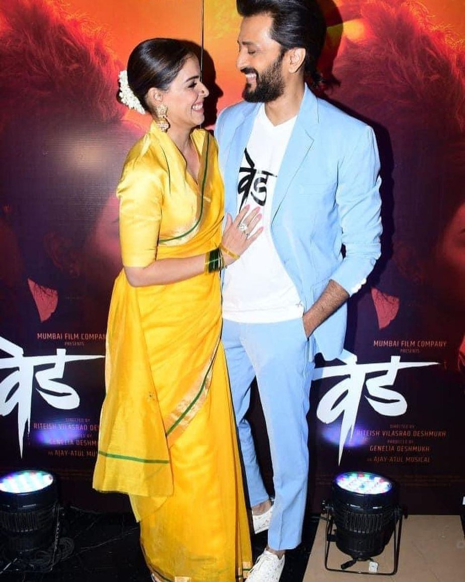 The adorable star couple Genelia Deshmukh and Riteish Deshmukh would be again sharing the screen space in the latter’s directorial debut movie, “Veda”. Loosely based on the Telugu movie, “Majili” the movie is a drama love story and also has a long list of other actors. For the promotion of the movie, Genelia wore a yellow saree by Raw Mango and stole the show.