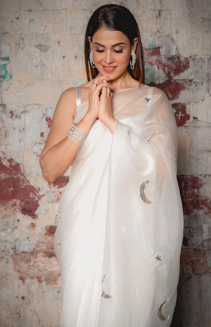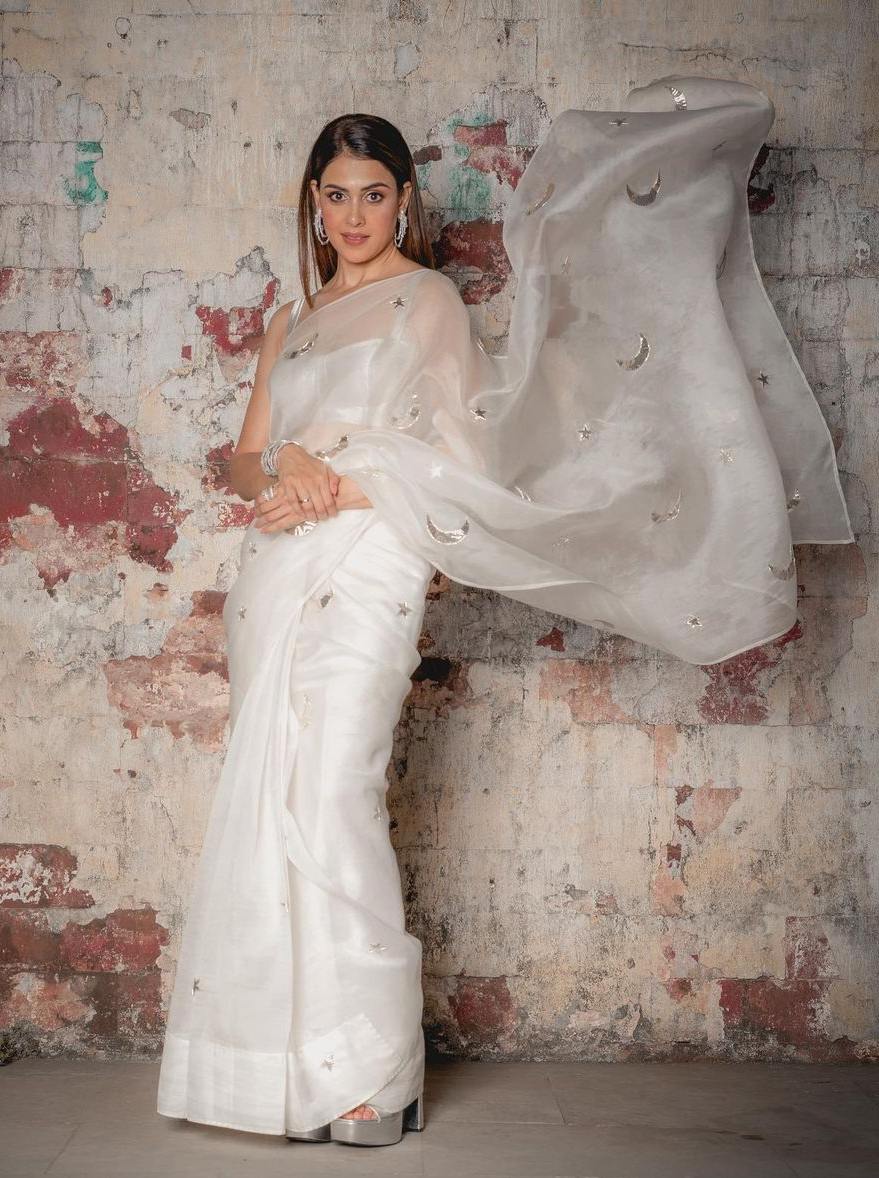 Actress Genelia Deshmukh and Riteish are busy promoting their movie “Ved.” The couple was spotted at the film city shooting for the latest episode of “The Kapil Sharma Show.” And the ensemble cast also joined the duo to ensure a blockbuster opening for Riteish’s directorial debut. For the event, she was seen wearing a white organza saree by Kapardara. Known as the “Moonlight” saree, this one is from their Cosmic Wonders collection.