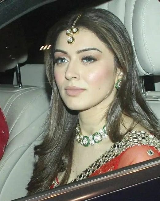 Since it is a festive look, she wore a pair of stone studded polki earrings, a neckpiece, a maang tikka and a polki bangle. A wavy hairdo, winged eyes, blushed cheeks and nude lips complemented the look