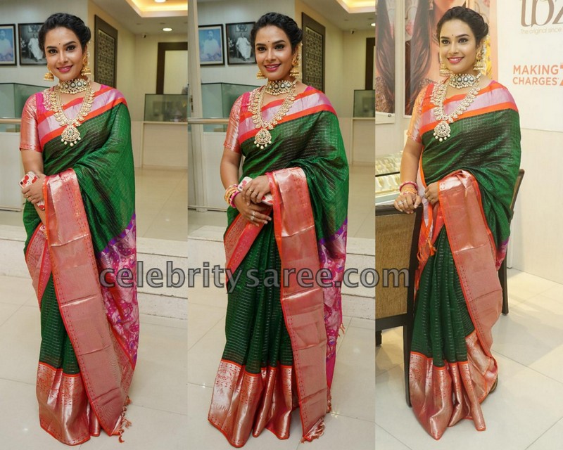 Actress Hari Teja wearing dark green traditional silk saree with golden color and silver zari weave rich floral border and checks saree. Paired with contrast blouse and traditional jewellery. She made an appearance at TBZ show room launch.