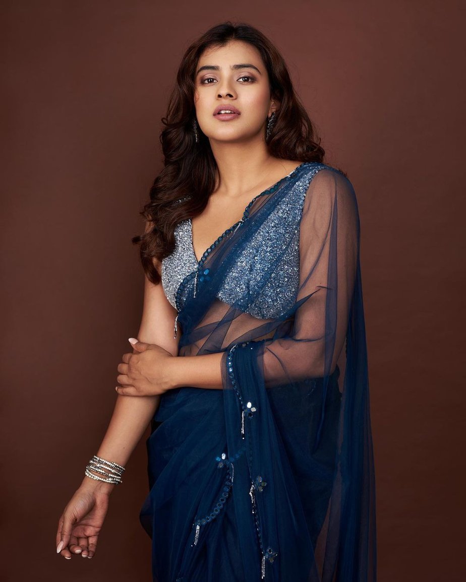 Actress Hebah Patel always makes us want more of her saree styles. She wears some amazing numbers that make it difficult to take our eyes off her and her latest look isn’t any different. She is seen wearing a blue sheer saree by Geethika Kanumili for an event she had to attend. The saree is from the designer’s Gulaal collections.