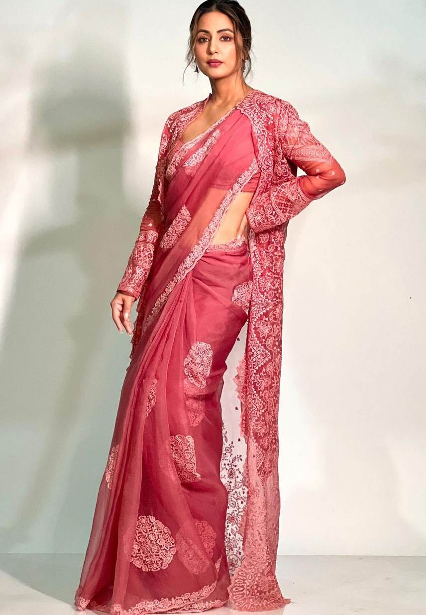 Actress Hina Khan has been a fashion icon ever since her stint at Bigg Boss. Not only does she inspire a lot of ladies, but also gives them some major sartorial choices which are attention-worthy. Her latest photoshoot has her wearing a blush pink saree by Torani and we are smitten. This one is from the designer’s Kaaya Collections.