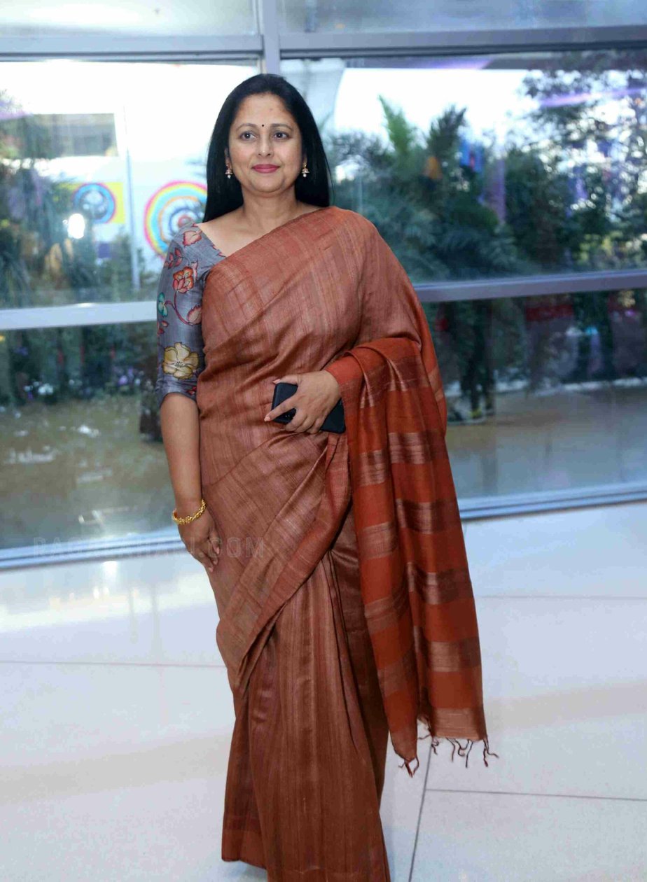 Jayasudha attended Vaarasudu movie press meet event wearing a brown raw silk saree paired with grey floral printed raw silk blouse. She kept the rest of her look simple!