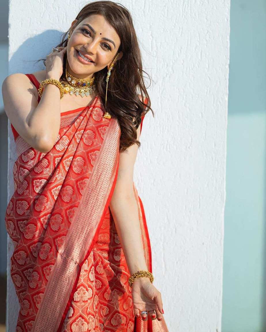 Actress Kajal Aggarwal had taken the internet by storm earlier this year with her pregnancy announcement. Now the beauty has posted some beautiful pictures from her baby shower ceremony and we are all over it. For the occasion, Kajal dresses up in a red saree by Kshitij Jalori.