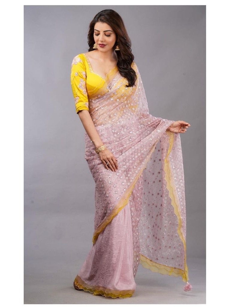 While we were just cherishing her latest saree look, actress Kajal Aggarwal has dropped another picture in a blush pink saree from an ad shoot she had. The sheer saree is from Madsam Tinzin’s monsoon’21 edit.
