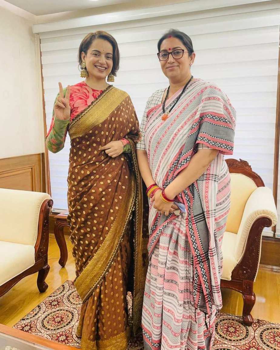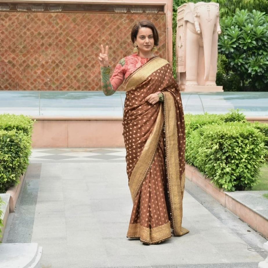 Actress Kangana Ranaut who has been busy selling her film “Thalaivi” determined to host a particular screening for all of the parliamentarians at present. For the formal occasion, Kangana determined to put on a espresso brown Benarsi saree by the designer “Sabyasachi.”