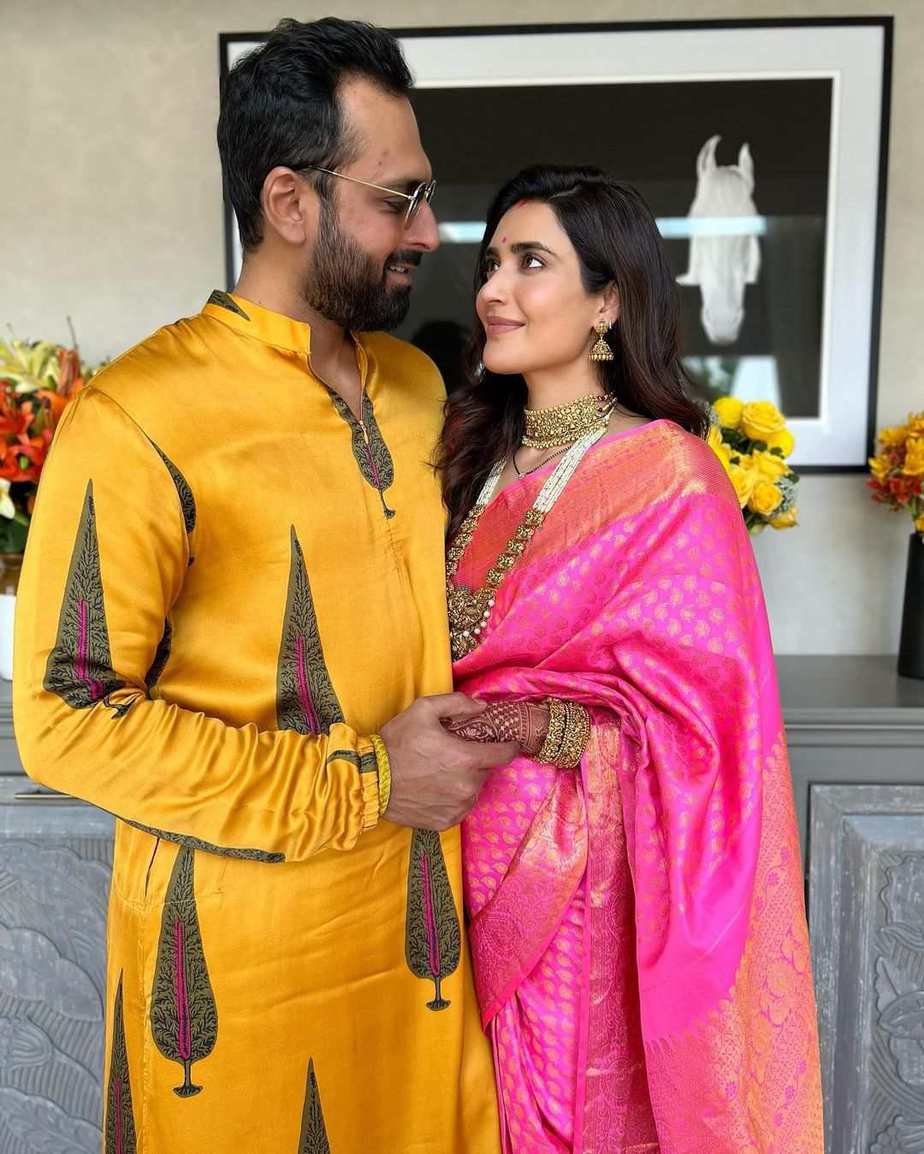 Only we know how much we have gushed over actress Karishma Tanna’s wedding pictures! The actress looked like a dream in all the attires she wore for her pre-wedding festivities and on the wedding day. The beauty has now given a glimpse of her attire post-wedding. For the Grihapravesh, she is seen donning a pink benarsi saree gifted by her mother-in-law.