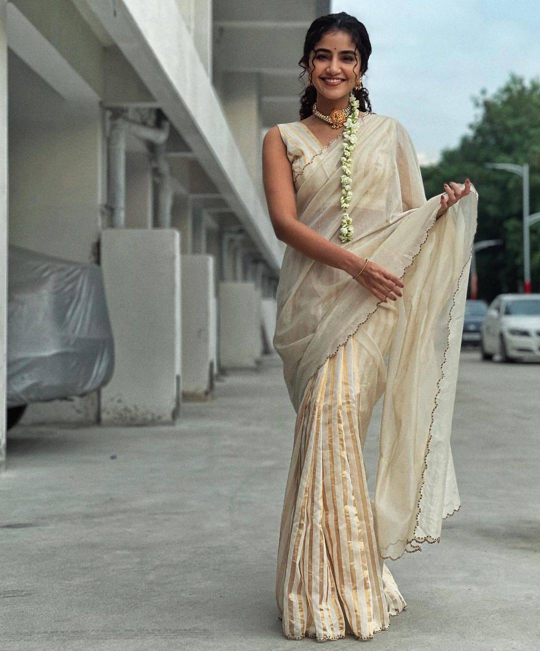 2. Anupama Parameswaran in an ivory striped saree by Jugalbandhi-anupama parameswaran in ivory saree by jugalbandhi for onam'22