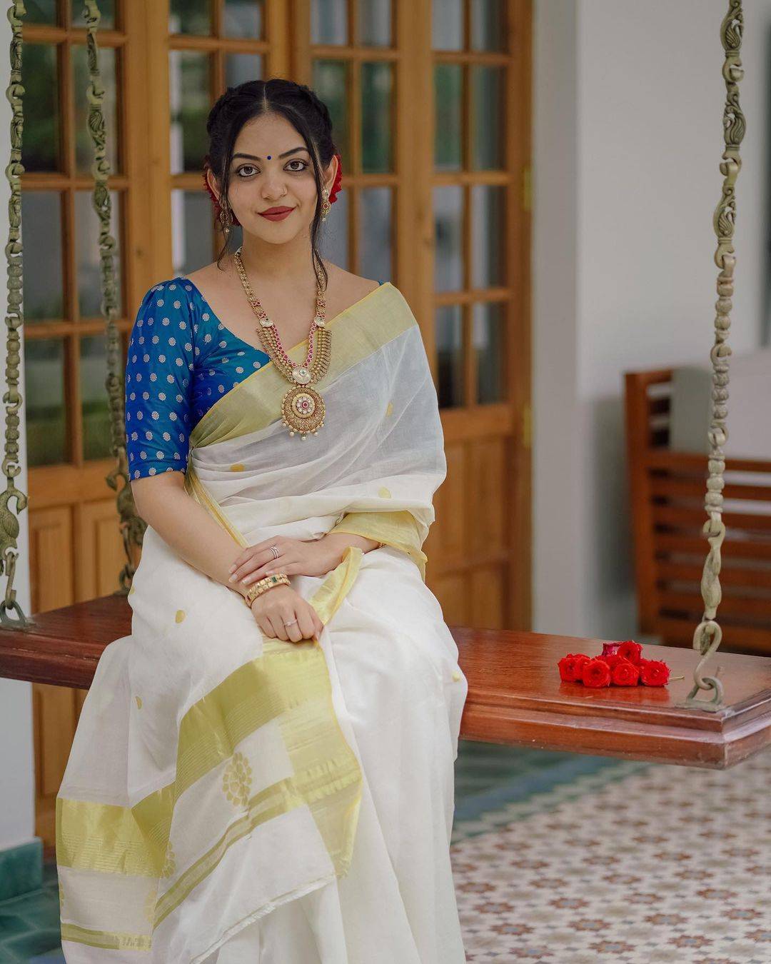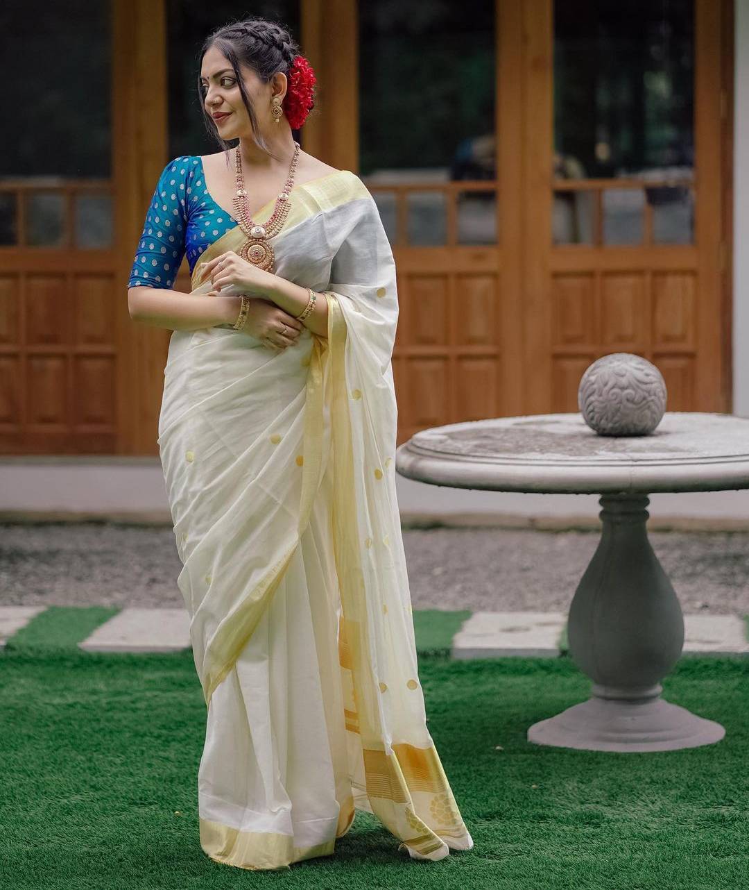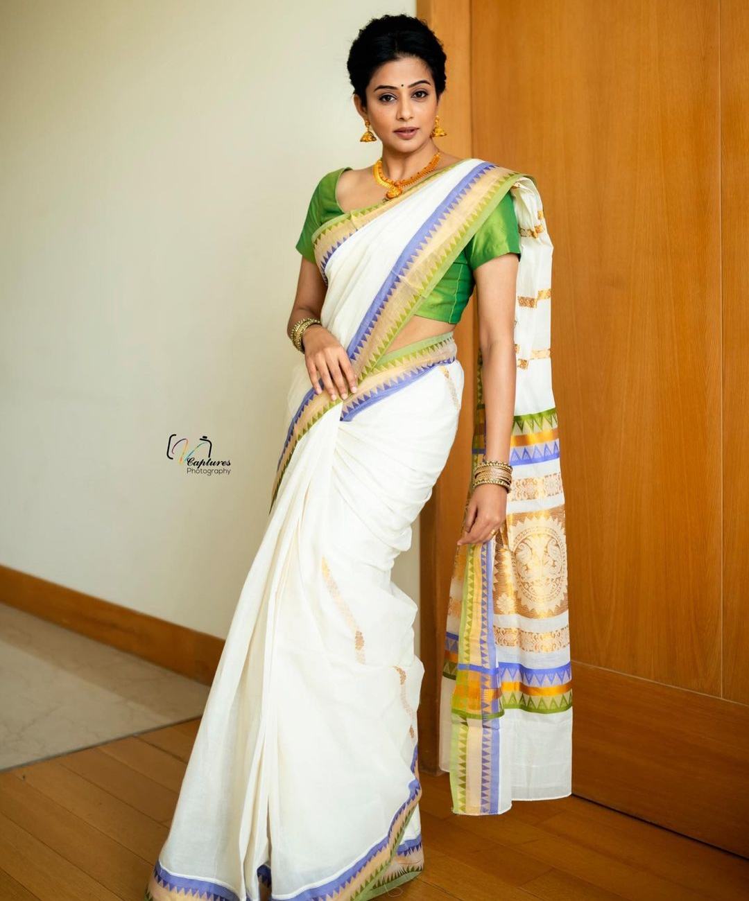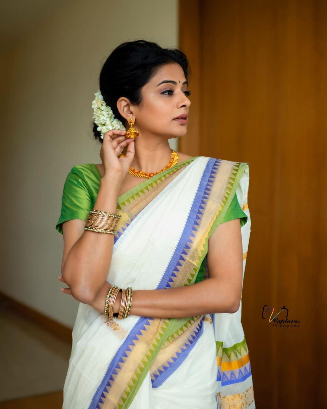 3. Priya Mani Raj in a white saree-priya mani in a ivory kerala saree for onam