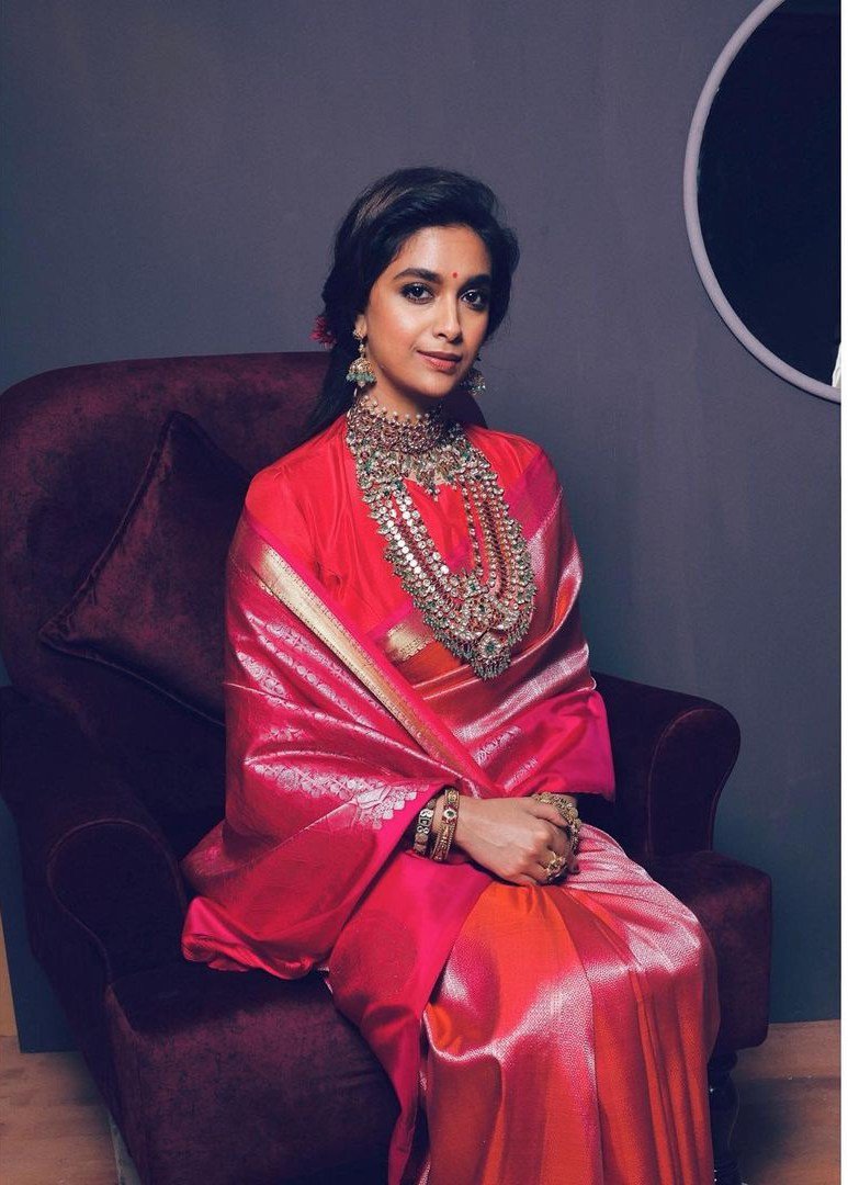 She decided to accessorize the look with a pair of antique gold earrings, a choker, a long neckpiece, a set of earrings and a ring by Jos Alukkas. A gajra adorned bun with blushed cheeks, kohl-rimmed eyes, a bindi and red lips accentuated her look.