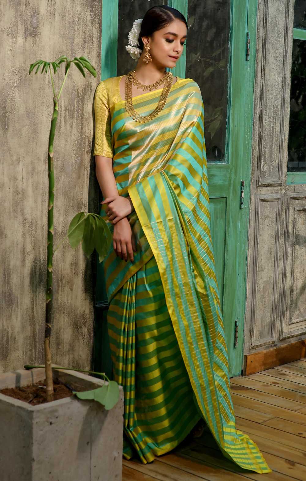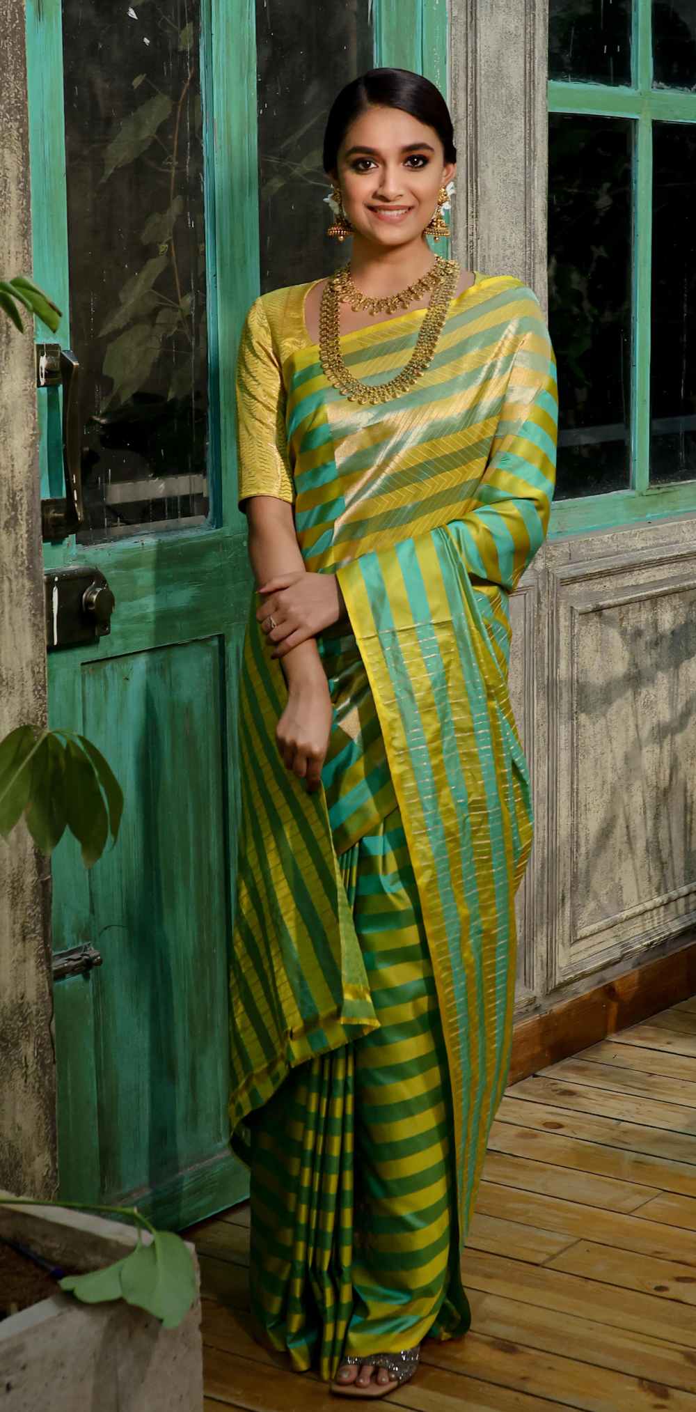 Actress Keerthy Suresh is too benevolent it seems. Not for nothing, the beauty has been serving back-to-back saree looks for her movie promotions as well as her friend’s wedding. Her latest set of pictures has her wearing a gold striped saree by Shanti Benaras.