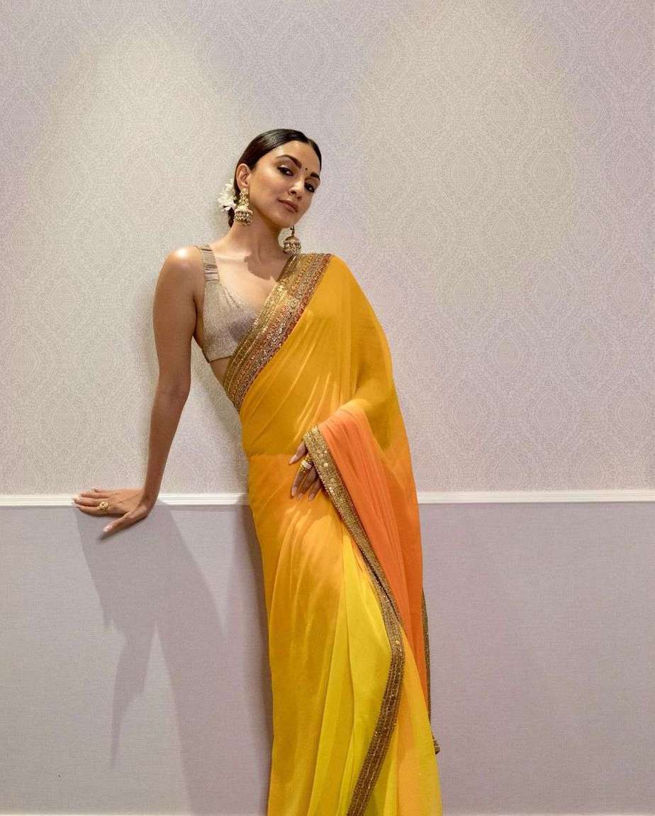 Kiara Advani in a yellow saree by Tarun Tahilani for dspa'22The saree is plain in nature with no prints or embellishments adorning its body. However, it is beautified with an orange hue towards its pallu. Its borders, on the other hand, display intricate hand embroidery in beads, threads and stones. It is paired with a strappy sleeved corset with a shiny upper base though it was left plain as the saree.
