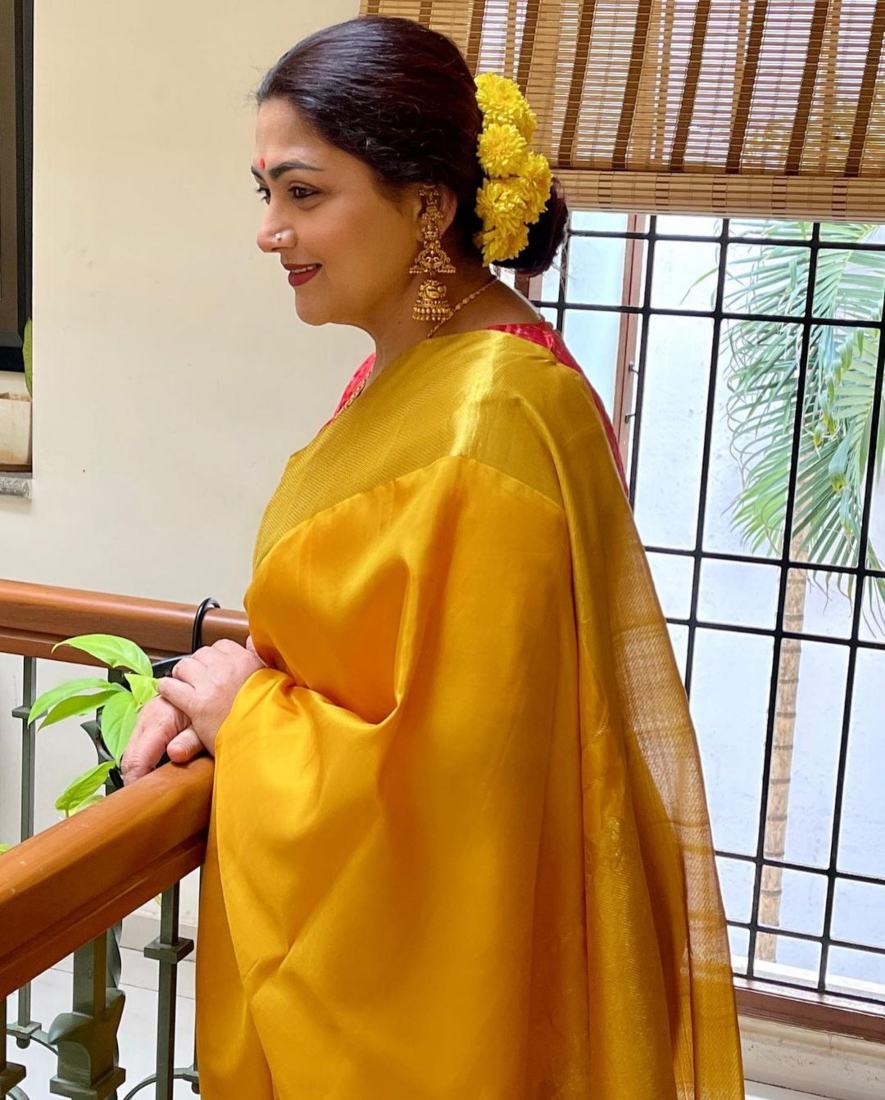 Kushboo Sundar appears to be like festive prepared in a yellow pattu saree for Ganesh Puja!