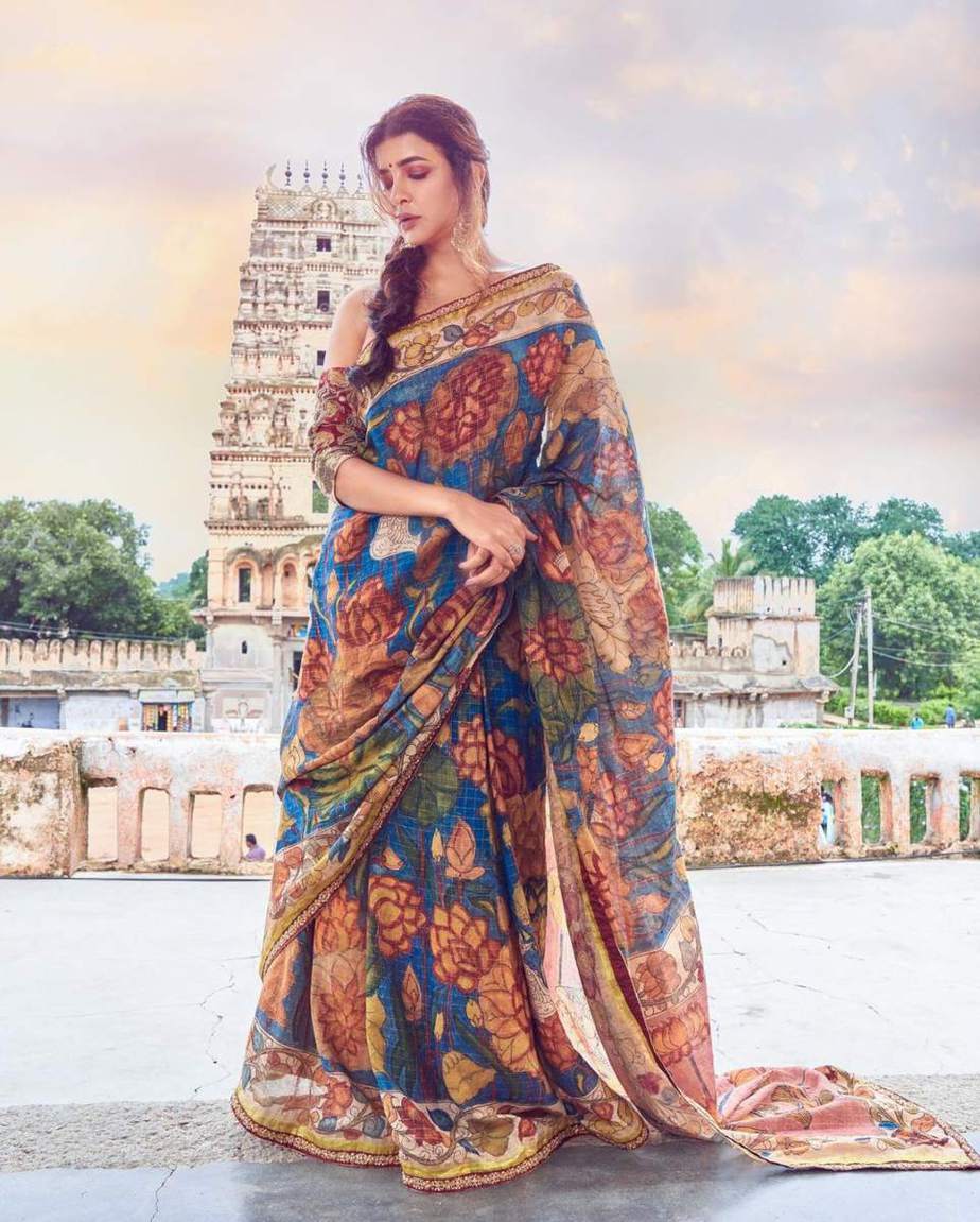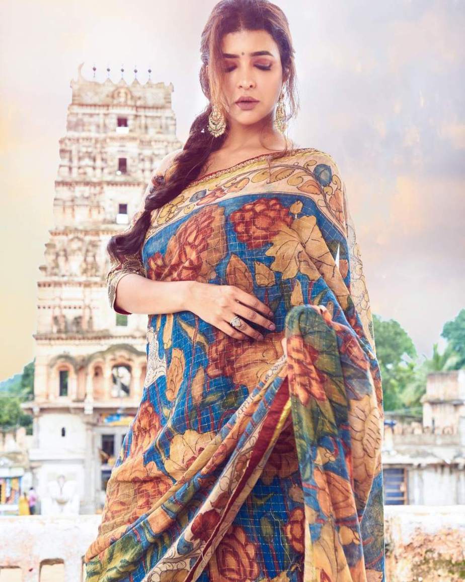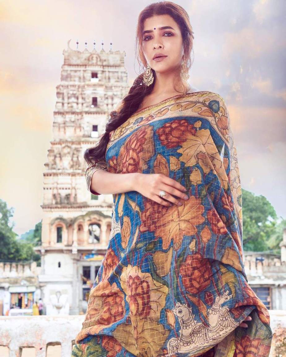 When it comes to draping on traditionally worked sarees, we all get a little too excited. Firstly because these are extremely beautiful to look at and secondly because they pay an ode to our age-old civilization. If you are a fan of indigenously worked sarees, try laying your hands on this saree worn by Lakshmi Manchu for her saree series. This one is a blue kalamkari saree and is available for purchase.