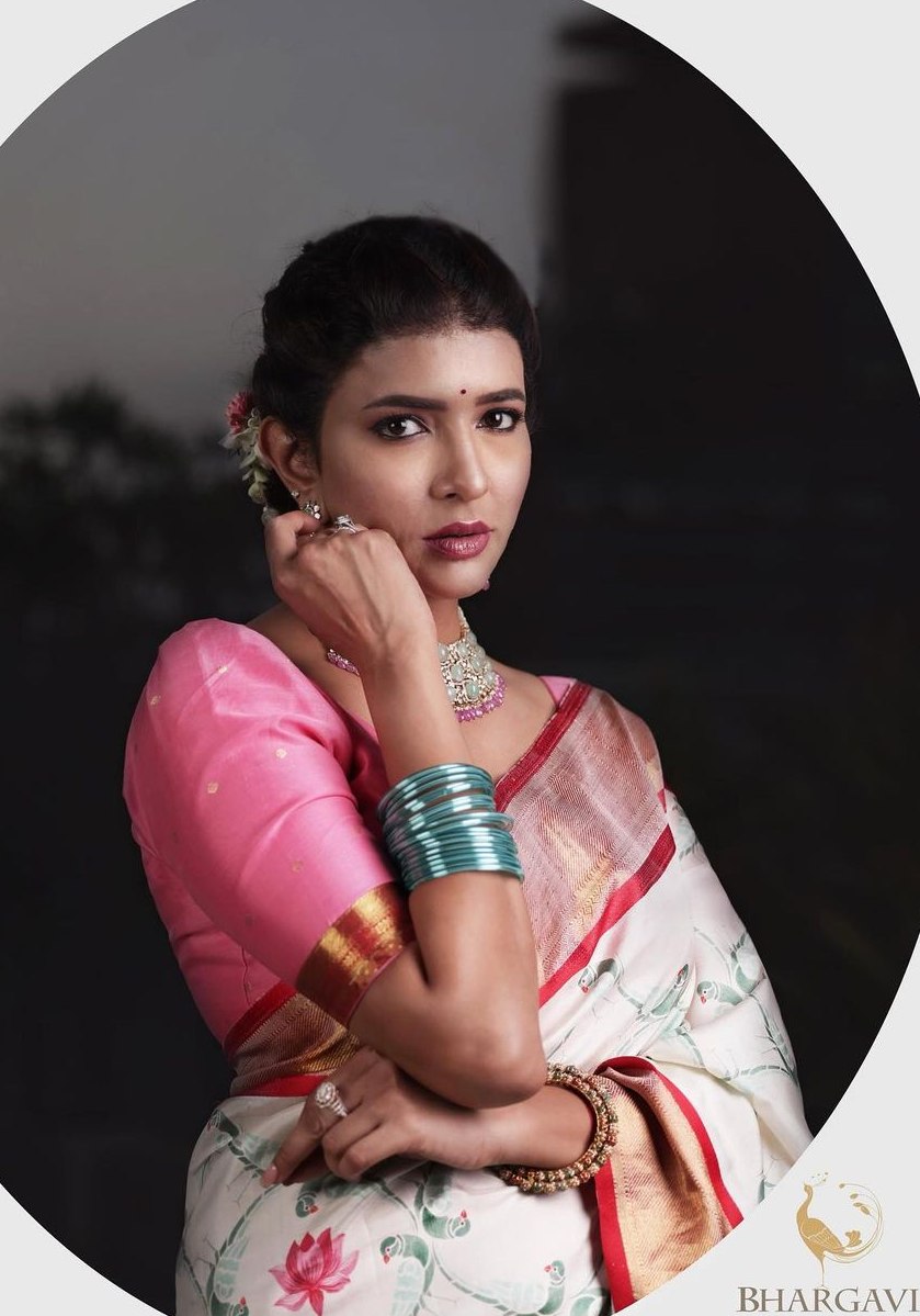 The white-bodied saree showcases hand-painted lotus motifs in pink with powder blue bird patterns on it. Its border, on the other hand, is highlighted in red with a gold pattu border. Its pallu in blood red is highlighted with gold stripes and adds to its grandeur. Lakshmi paired it with a soft pink-hued blouse with a red pattu decorating its puffed sleeves.