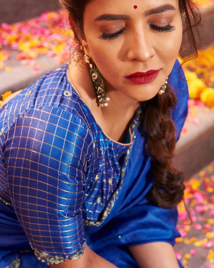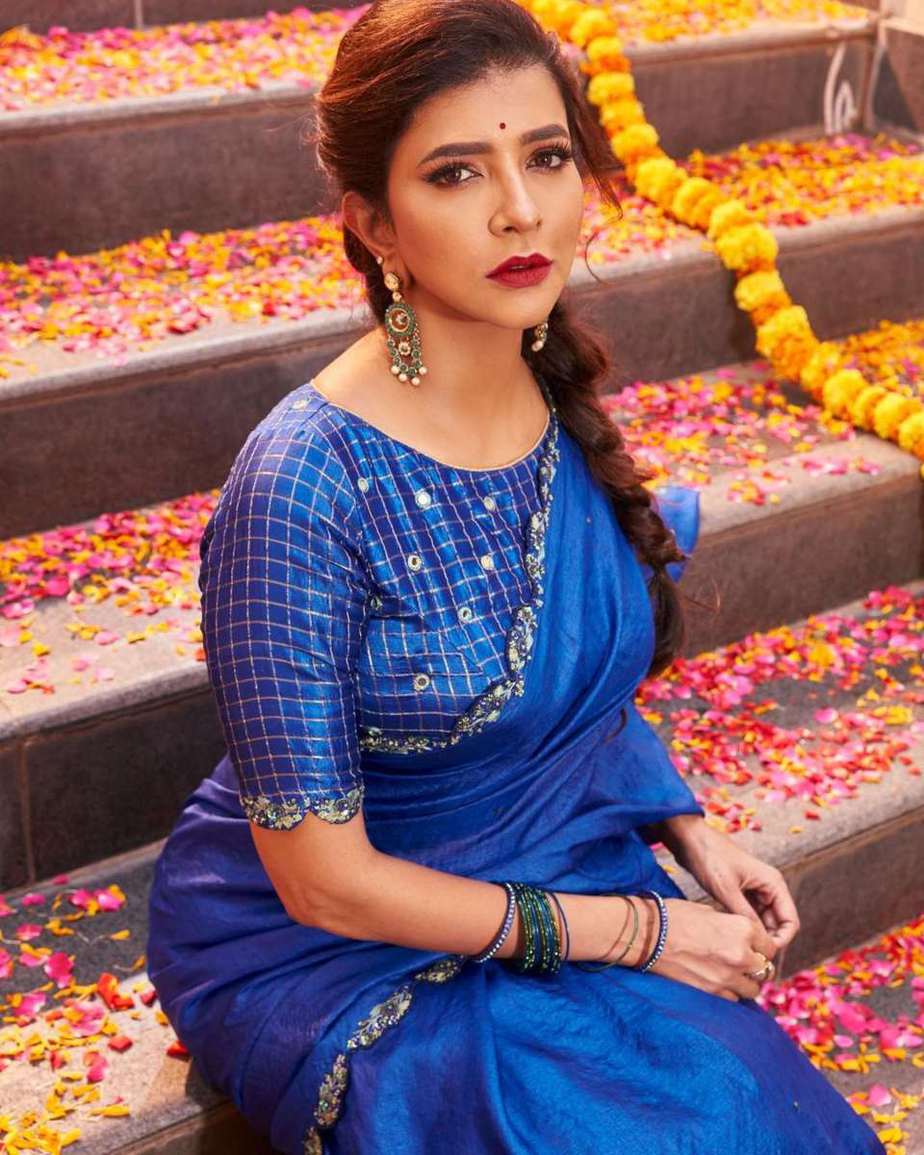 Lakshmi Manchu’s saree series is a huge hit among her fans on social media. And living up to their expectation of doing it better every day, the actress makes sure her looks are unique for each day. For the Saptami, the actress chose to go with a royal blue Tussar silk saree which we think looks terrific in every sense.