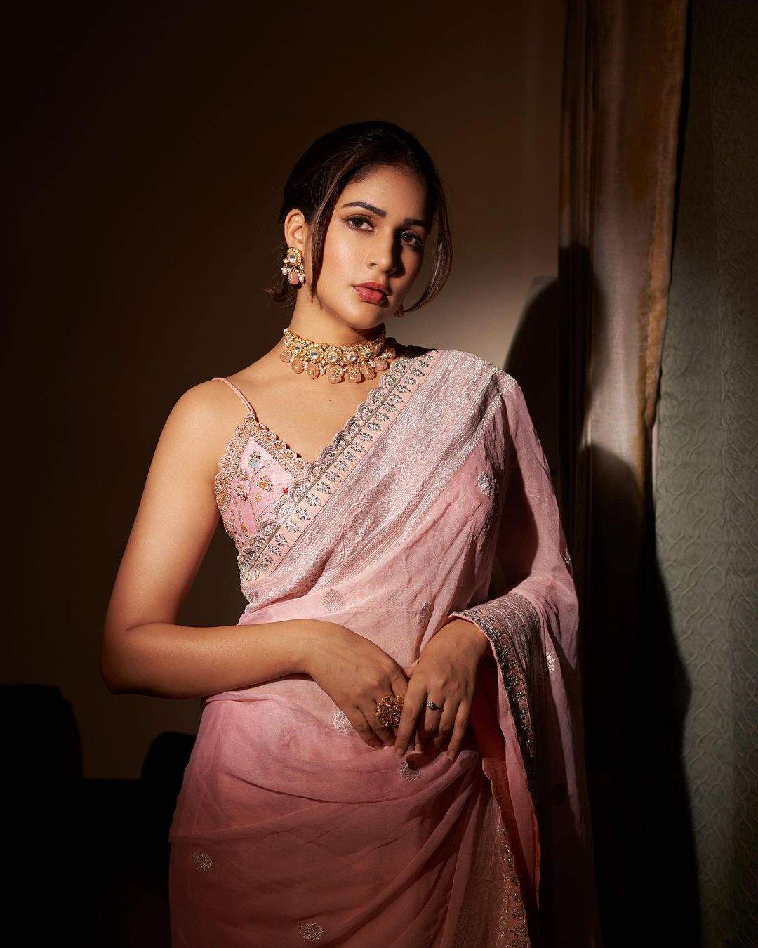 She styled the look with a pair of matching pink stone studded earrings, a choker and a ring by House of QC. We also loved her pair of juttis by Fizzy Goblet. She rounded out the look with a mid-parted bun, blushed cheeks, winged eyes and glossy lips.