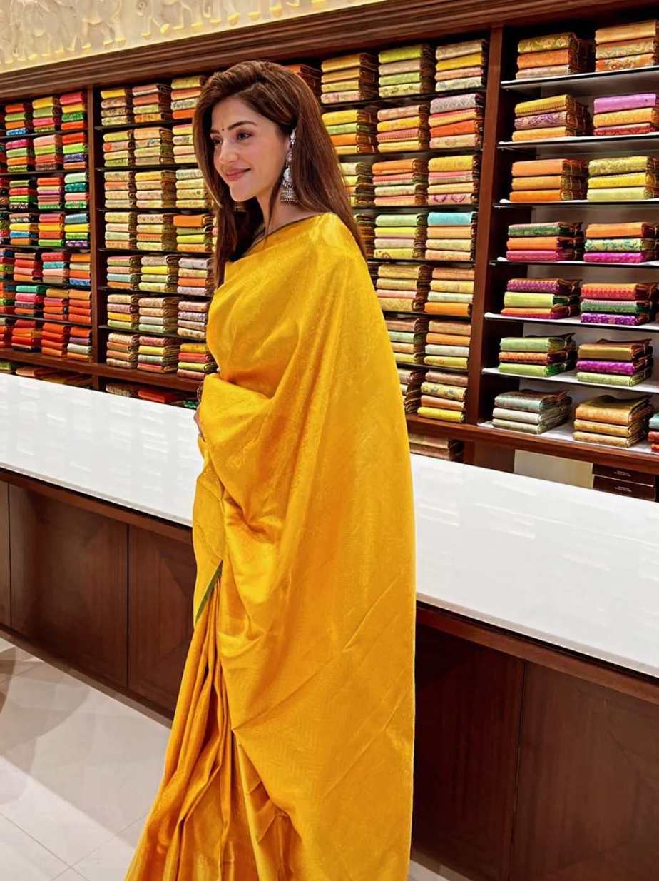 Actress Mehreen Pirzada has been running a busy schedule with inaugural functions and movie promotions. The actress was spotted last day in the city cutting ribbons for a new silk saree shop. For the occasion, she wore a yellow saree and we loved the look.