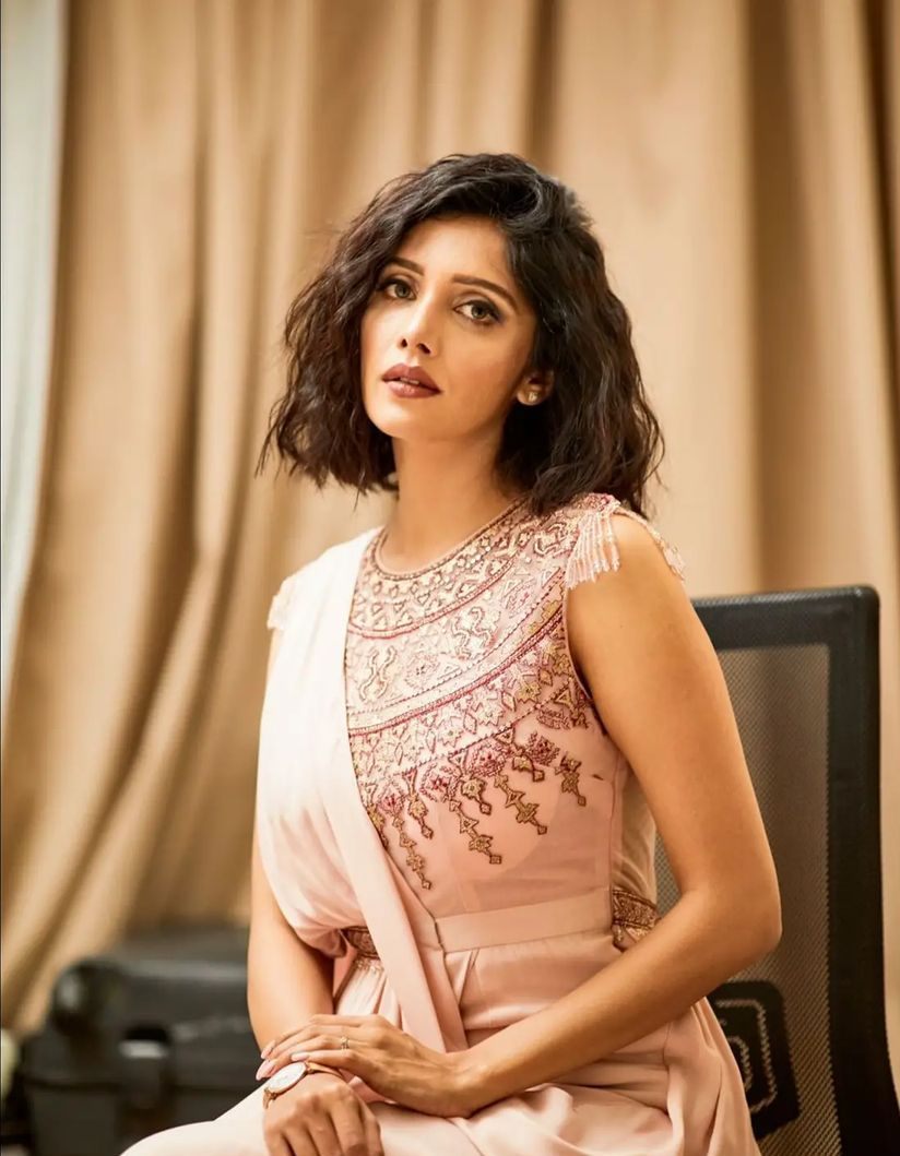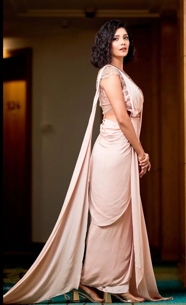 Twinning with her husband, she also went with a pink saree gown by Pernia’s Pop. The georgette wear had its beauty attributed to the embroidered neckline it featured along with tasselled epaulettes. Moreover, the belted pleats formed a train towards the pallu. She kept the look minimal with just a pair of nude sandals.