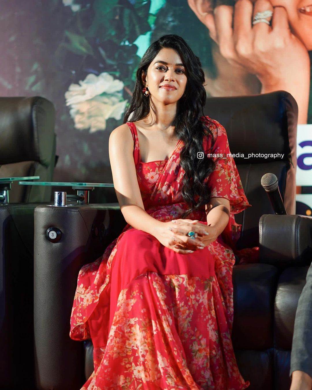 mirnalini ravi in red pre draped saree by devragh for cobraThe pre-draped saree is adorned with floral prints on its upper half while the waist is in plain georgette. Moreover, its pallu also shares these details along with ruffles on its hem. She matched it with a sleeveless floral printed blouse.