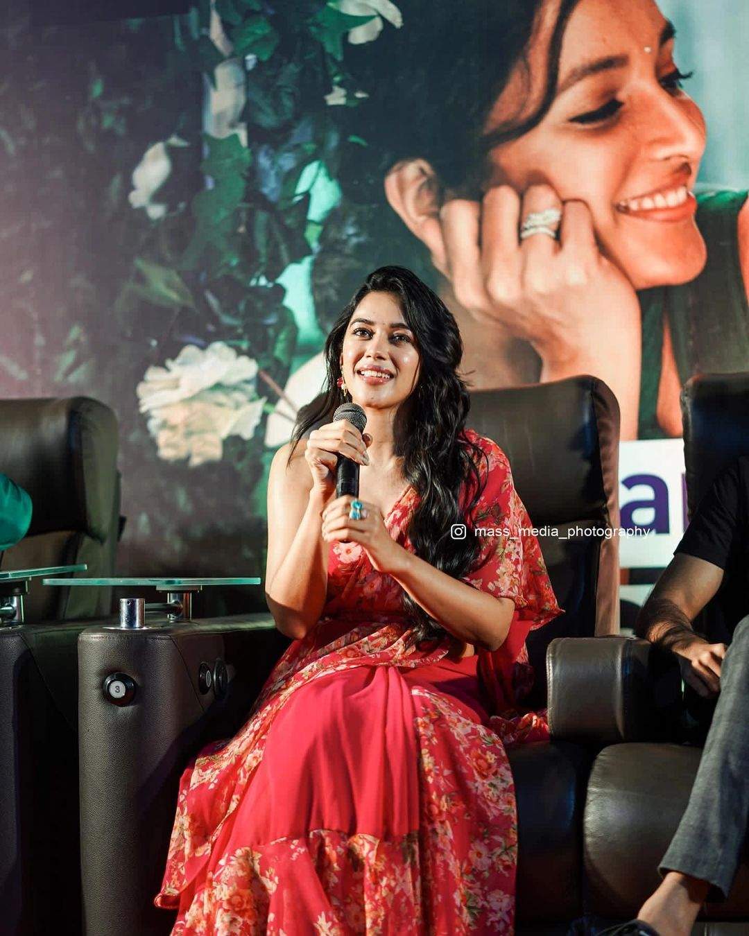 Mirnalini Ravi’s radiant look in a red floral saree for “Cobra” promotions! Celebrity Sarees