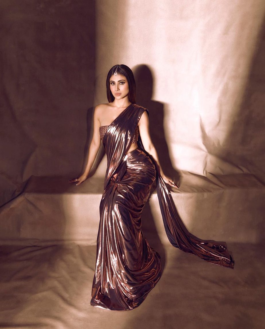 Metallic sarees have become so popular that they are often seen in our favourite celebrities. The shiny fabric with its unique look often turns heads and therefore has a huge demand. Not only does it elevate your svelte silhouette but also is easily manageable. If you are unsure about one, try this rose gold pre-draped saree worn by actress Mouni Roy for “DID Lil’ Masters”. This one is designed by Deme.