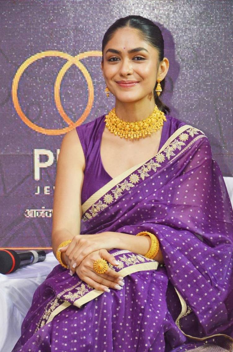 Actress Mrunal Thakur is now a widely popular face in the country. Her pan-Indian movie, “Sita Ramam” has managed to charm everyone beyond the constraints of language and ergo loved by everyone. So it was no surprise when PNG Jewellers wanted Mrunal to be the face of their new festive campaign. Last day she was spotted at the launch ceremony in a purple saree.